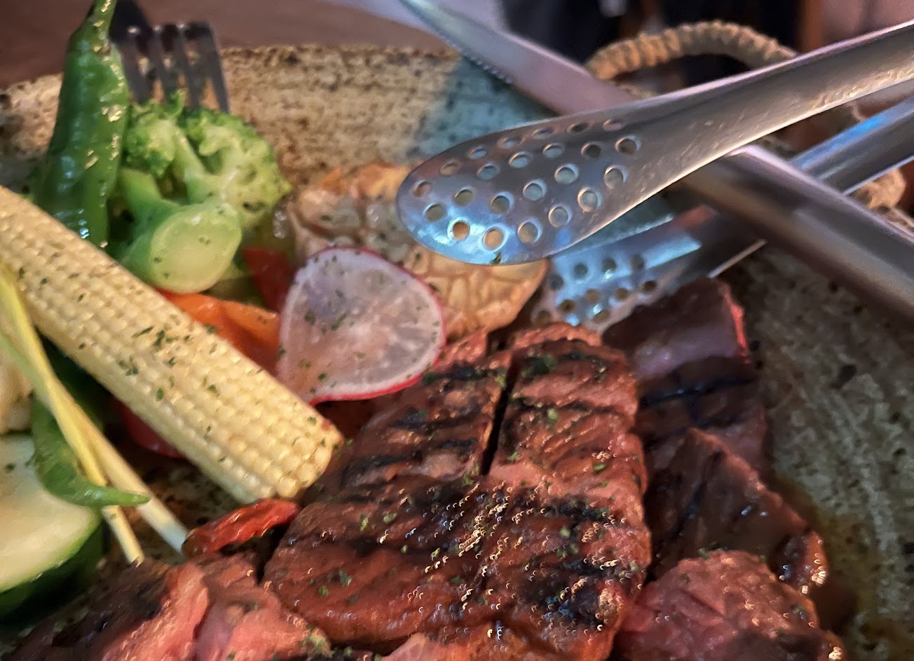 我吃了烤牛肉燴飯,還有美味的脆皮雞肉和蘑菇麵包。哇!
