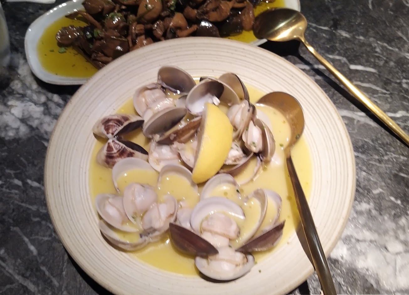 品嚐的餐點為:口感Q彈的爐烤香餅搭配風味濃郁的布拉塔cheese、野菇香氣十足的油封蘑菇、鹽醃鮭魚搭配鹹蛋黃,風味層次十足、帶有奶油蒜香及檸檬清香的蛤犡鍋、松露蘑菇燉飯、鮮嫩可口的戰斧牛排佐細緻的松露馬鈴薯泥、微脆口感的藍紋乳酪pizza及焦糖烤布蕾!! 戰斧牛排搭配店家推薦的酒品,更能呈現更多層次的搭配~每口肉、每口酒都可以有著驚豔的味蕾感受!