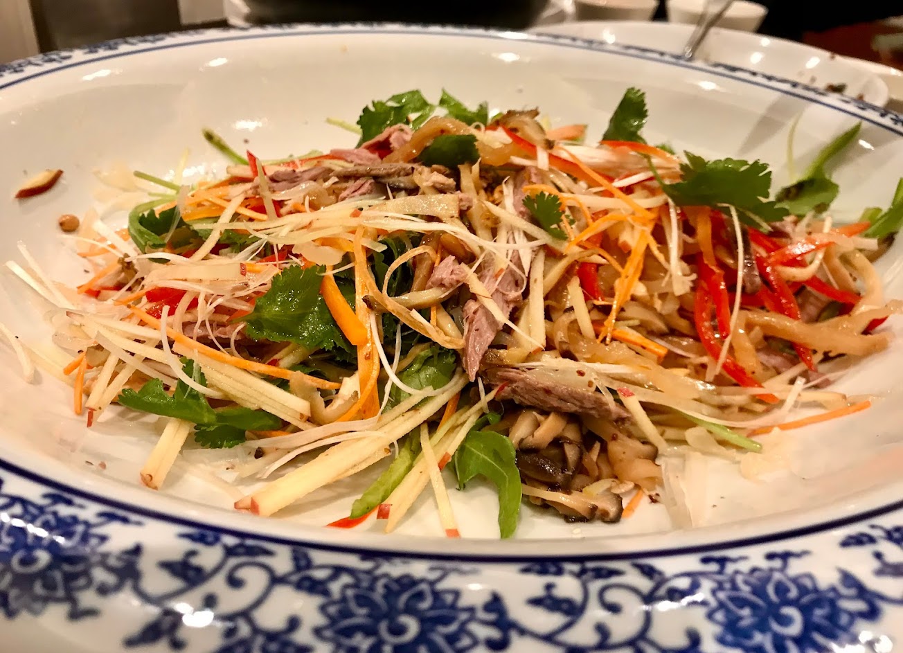 先說說他的招牌烤鴨,鴨皮烤到非常脆口,且鴨皮仍保有薄薄的油脂且不膩口,而在口腔中咀嚼時整個爆發最大限度發揮鴨肉原本的風韻,香氣非常濃郁,完全沒有沒有鴨肉油脂腥羶,這個是100分的鴨皮無誤!!? 而片下來的鴨肉也非常軟嫩多汁,不會有一般鴨肉的乾柴口感,非常完美,另廚師會再鴨腿取下斬切裝盤,鴨腿也非常Q彈,配上鴨腿的皮濃香有嚼頭,又是一個完美,另炒鴨架也在水準之上,用蔥段及洋蔥等爆炒,香氣十足帶有鑊氣,且炒掉不油非常可口,另部分鴨肉切絲煮成鴨粥煮了一大鍋,我們還擔心吃不完,結果吃到見底,可見美味一般!