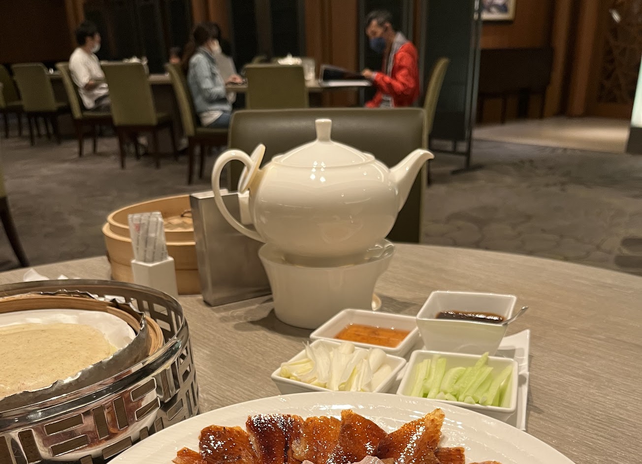 烤鴨絕佳,甜麵醬有調整。可惜三月取消港點,但多數的菜餚均精緻,口味優雅,推鎮江醋豬肋,有黑糖拿鐵的風味。由黑金包、流沙包可一窺港點的水準,擇日再試。