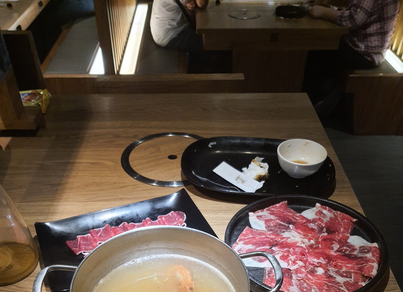 座位寬敞,環境乾淨。個人鍋有四種湯頭可以選,石頭火鍋的湯很鹹。菜盤的火鍋料很多,肉片偏薄。
