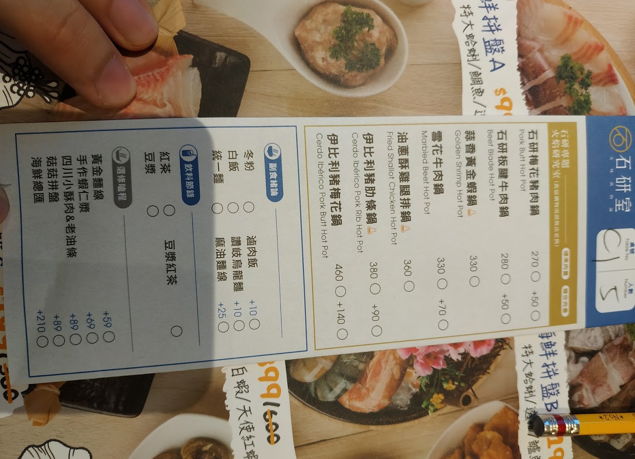 ?今日點:石研板腱牛肉鍋$280(肉片加量+$50),附餐有(白飯、冬粉、王子麵任選一)、菜盤及飲料無限續杯(豆漿、紅茶、豆漿紅茶)