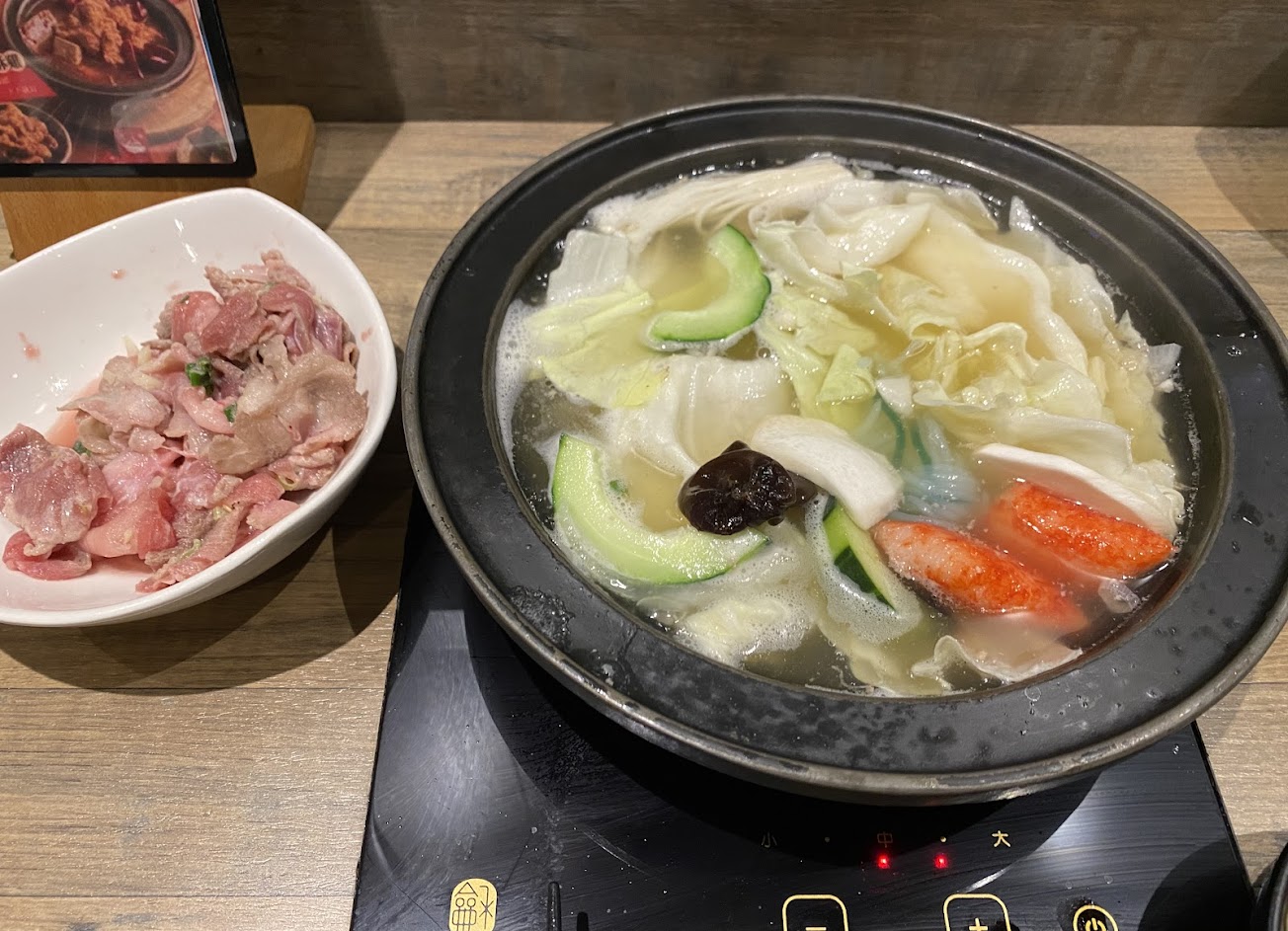 第一次來,打卡送肉(還滿多的),很平價,份量也多,青菜火鍋料是自助的吃到飽,CP值很高!湯頭還不錯