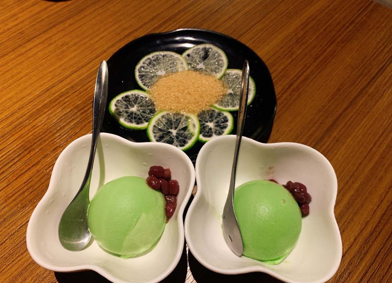 甜點是檸檬片撒砂糖,冰淇淋是抹茶口味,兩者都只有一份。