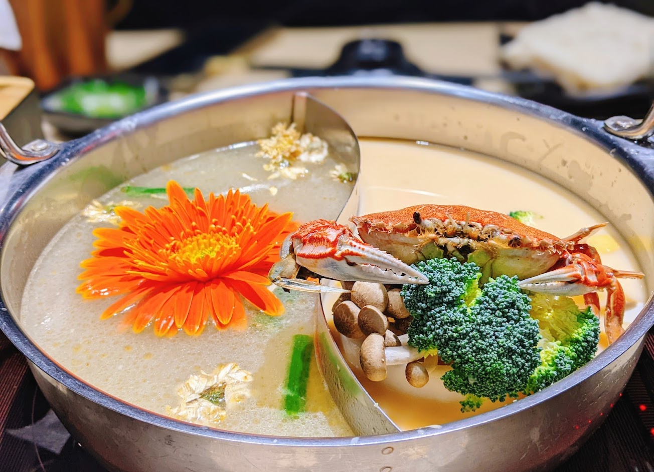 點了耐寒唯有東雛菊、松露蟹黃香四溢 的湯底,湯底的名稱都非常有特色,看得出來店家在這方面下了很大的功夫 店員將鍋底端上來時還會先問是否需要拍照後再將螃蟹推入湯裡;東雛菊這道湯底裡有一朵漂亮的菊花,店員說等湯滾後就可以將花撈出,除此之外,還有附上一碗老母雞的湯,之後再倒入湯裡一起煮 我點的是梅花豬,肉的份量挺多的,目測感覺至少有14片,每片都很大片且新鮮,稍微涮一下就可以吃,沾點醬油超好吃☺️ 朋友點的是土雞腿,用枸杞跟酒醃過,吃起來有酒味,特別好吃! 菜盤的部分份量看起來偏少,完全沒有火鍋料,都是蔬菜所組成,而且高麗菜還能續,後面我們都是狂吃高麗菜 我們還有點了秘制餐點:金輝酥香膏滿盈,裡面是滿滿的蟹肉,非常的特別,但是可惜在於外面的皮不夠酥脆,如果更脆一點會更喜歡 最後甜點是焦糖奶酪,湯匙的部分很特別,是一朵花的形狀,很想問問店家在哪裡買的 整體吃起來非常享受也很值得,服務費也是付的心甘情願,還會想光顧的餐廳?