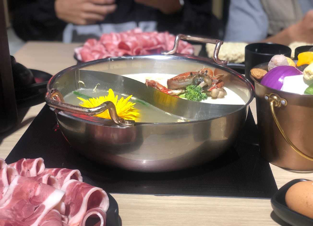 擺盤很精緻;用餐當天總共點了四種湯底,鳳梨的還滿讓人驚艷,招牌的東雛菊、蟹黃湯底沒有想像中濃郁。