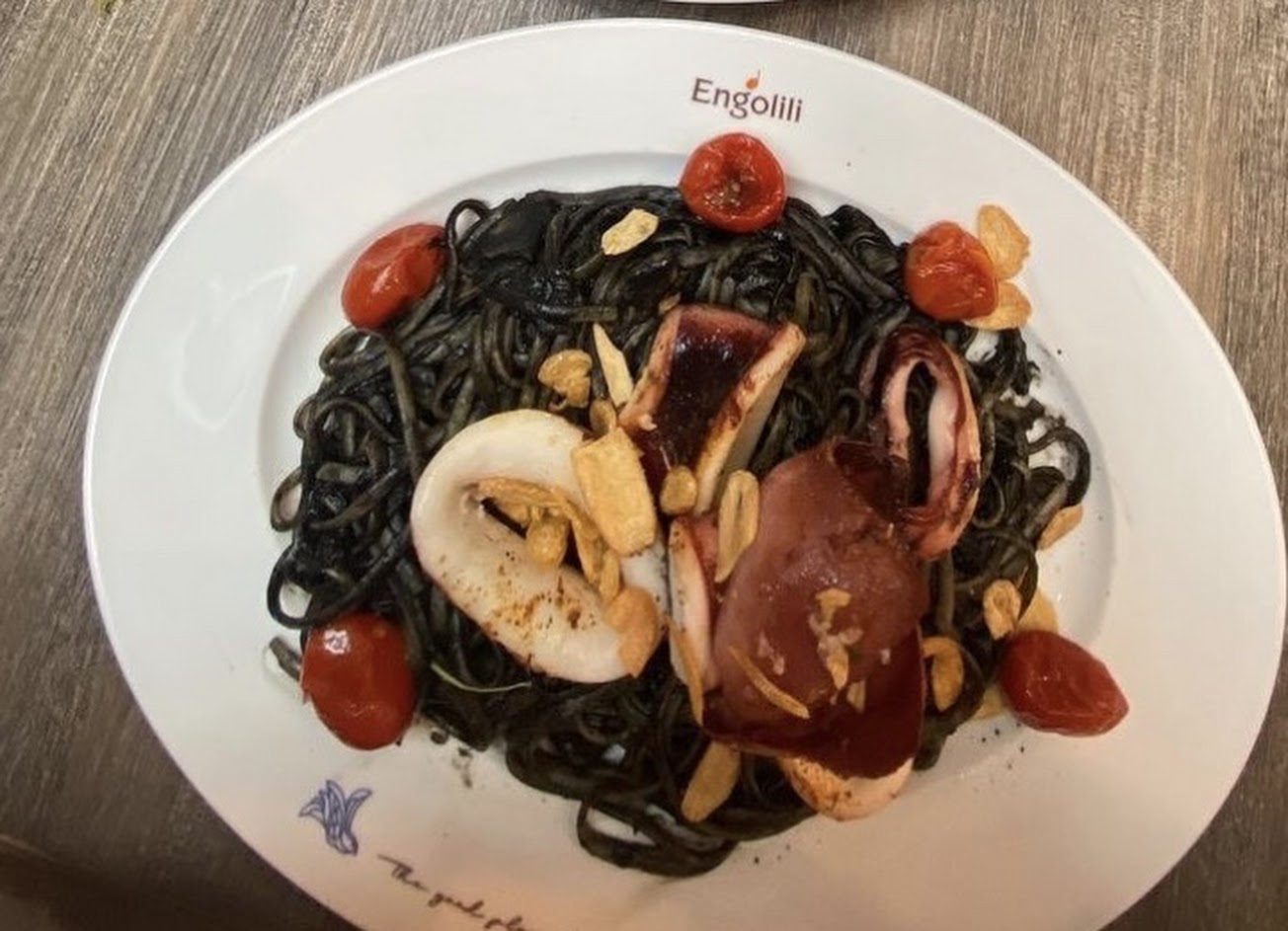 燒烤香料魷魚墨魚麵,墨魚份量足夠,喜歡墨魚的人會滿推薦的,魷魚的部分有點太有嚼勁,但滿完整的