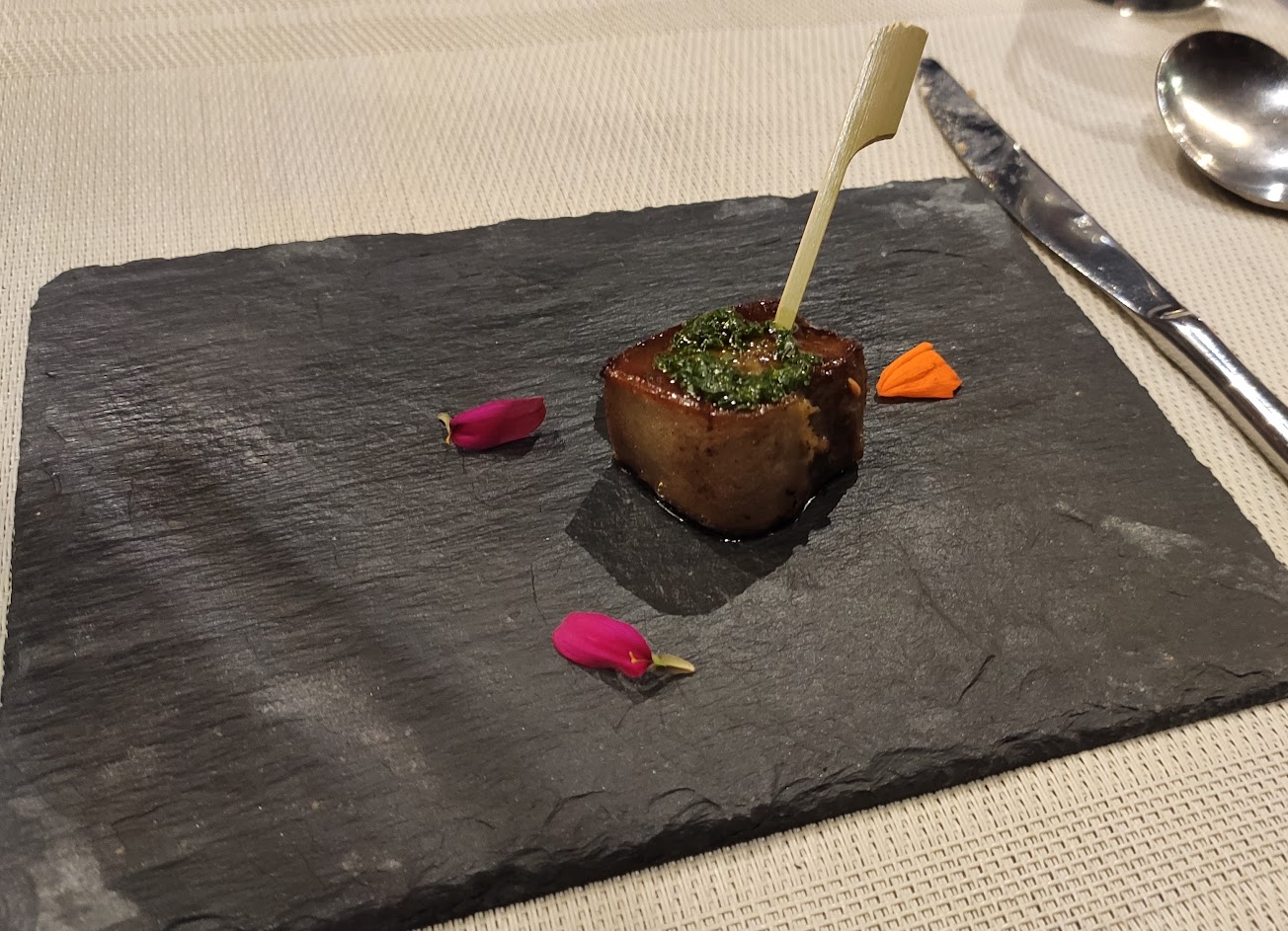開胃菜煙燻鮭魚、雞湯、清蒸龍膽石斑、主菜2選1(德國豬腳or焗龍蝦),吃到這邊都覺得挺好的,米糕跟甜點就比較不符合個人喜好,且吃完肚子立刻強烈翻滾,久久不能平復,每人1500個人可能就品嚐一次OK。