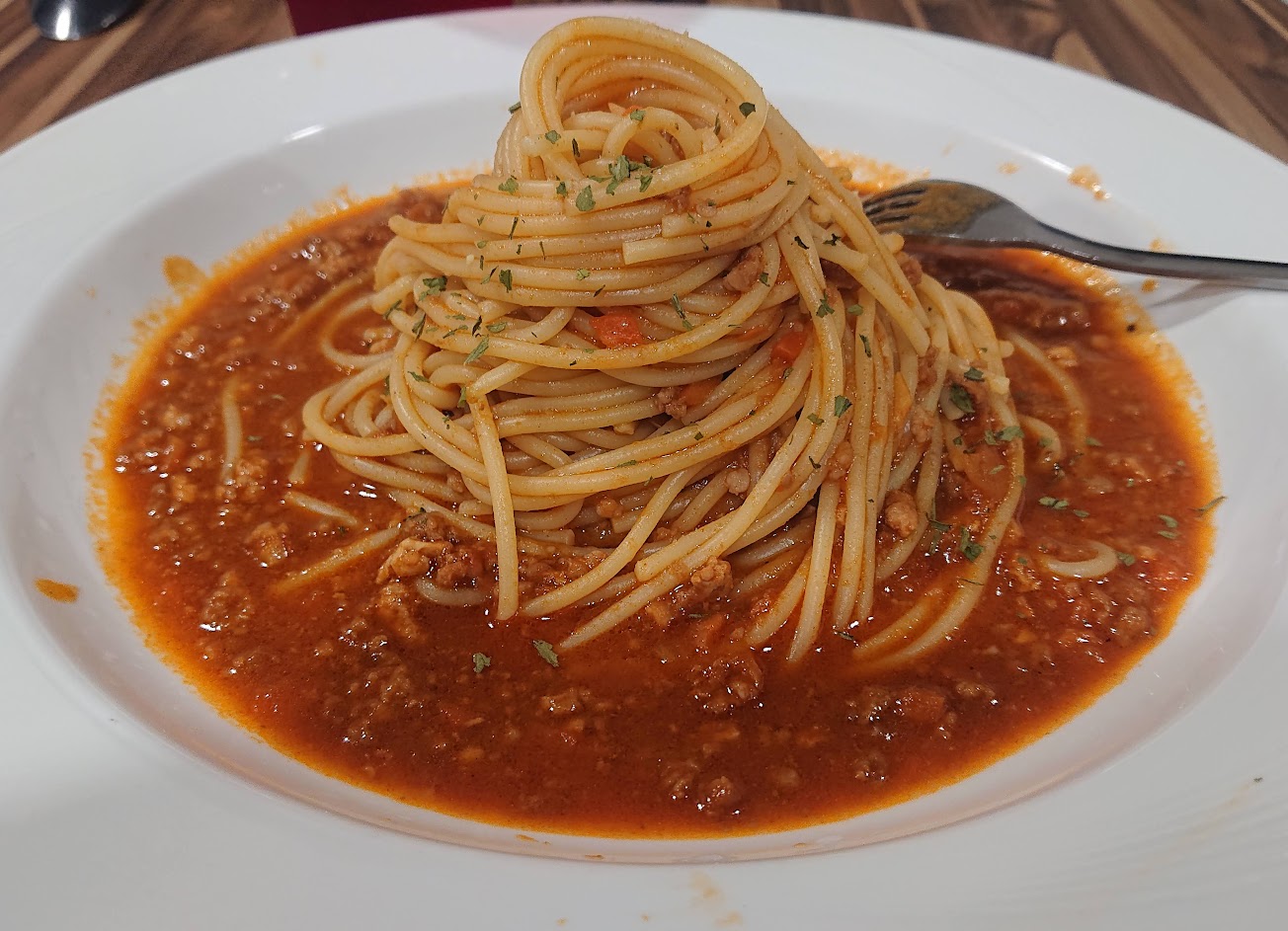 肉醬麵,原份量女生剛好,男生加麵比較飽。免費加飯加麵