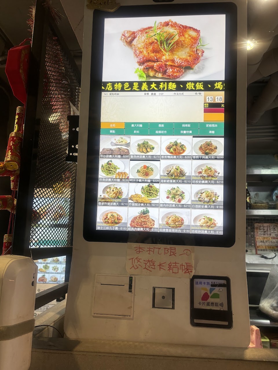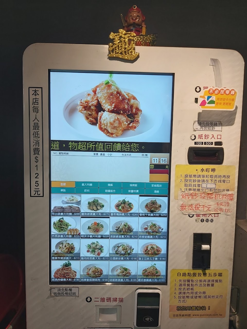 1.店家人手看起來只有兩位,點餐的話使用兩台餐點機,一台悠遊卡機,一般信用卡自動儲值是500元,兩份餐點4百多,儲值金不夠所以無法使用,另一台現金機,但不能收1000元,投入500元後機器顯示無法找零,還需要人工找錢,餐點機該有的便利功能並沒有體驗出來,較不便利。