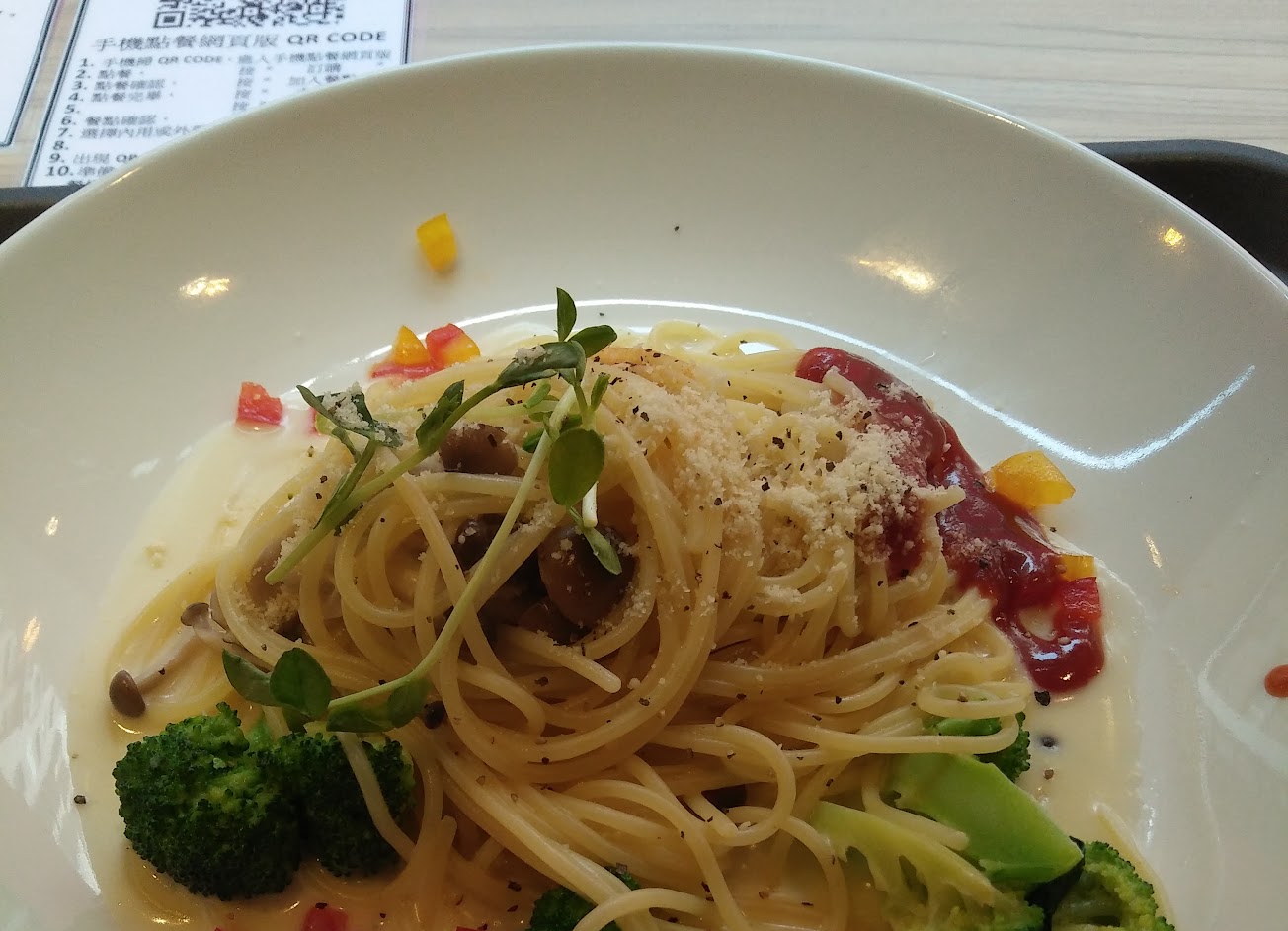 環境佳,義大利麵條Q彈有勁,奶油口味可做成素食(去蔥蒜),自助點餐後記得將號碼告知老闆,可協助客製化處理!
