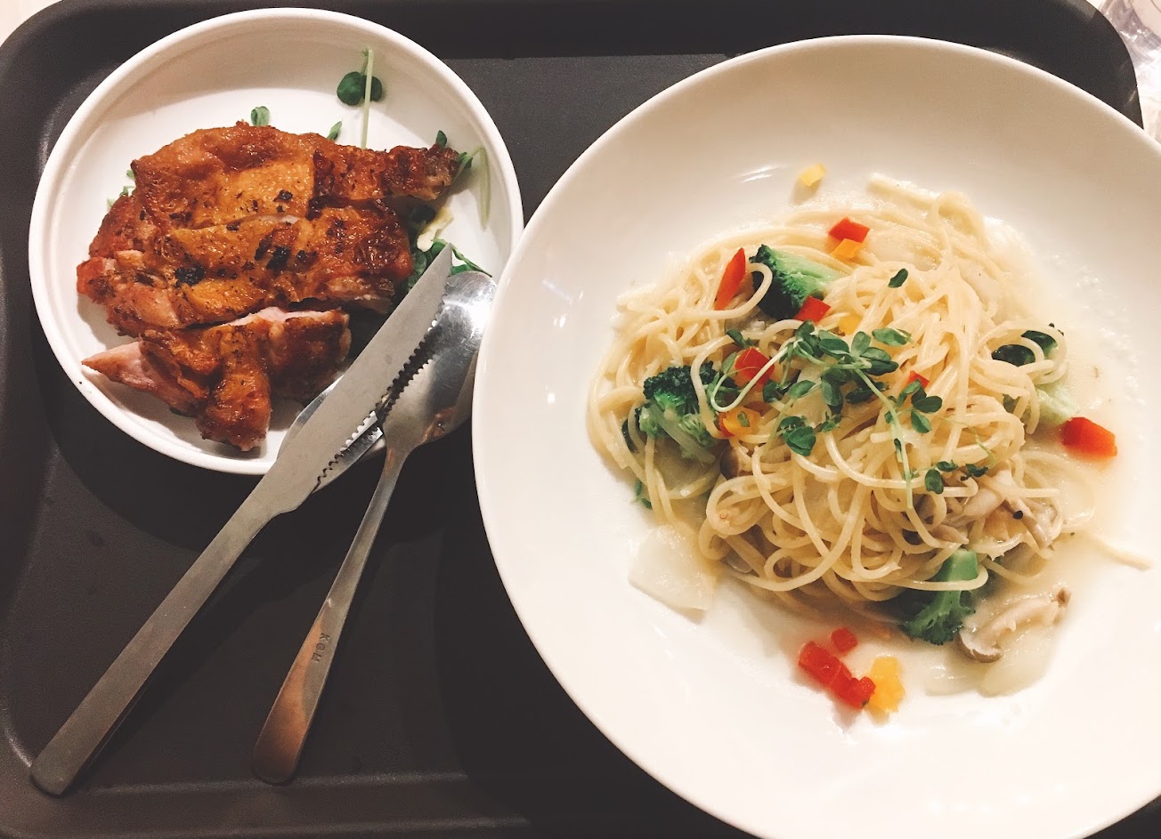 在補習街上的一間小義大利麵店,店家位置在三角窗二樓,店內乾淨不過出餐量大時,油煙味會比較重,一進門左手邊先自助機器點餐,餐點大約140起,不收服務費,點完餐後入座等機器叫號取餐,大約等不到20分鐘餐點就來了,算是有效率,這次點了雞排蒜香口味的清炒義大利麵(180)、奶油醬的焗烤飯(140)和一杯蘑菇濃湯(35),餐點的肉竟然是冷的,吃起來油耗味稍重,義大利麵也沒什麼料,就是幾塊彩椒碎塊,不過價錢也不貴,算還可以接受的!