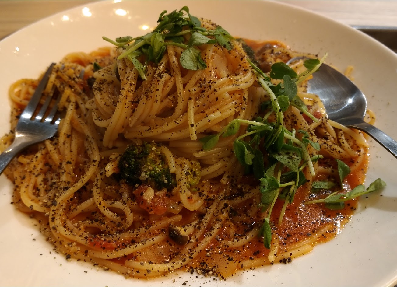 餐點份量算十足,義麵醬汁偏水,不是濃稠型的。不過另有起司粉七味粉可加。