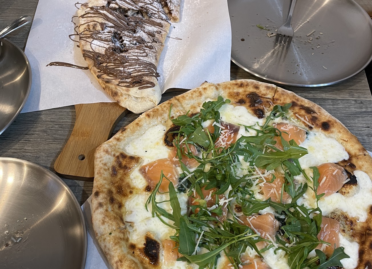 很喜歡鮭魚芝麻葉披薩料給的也不少,另外友人點的巧克力相較之下就普通,愛甜膩的人比較可能會喜歡,而且做成披薩餃咬起來比較累。當天人多位子在走道上不太方便。