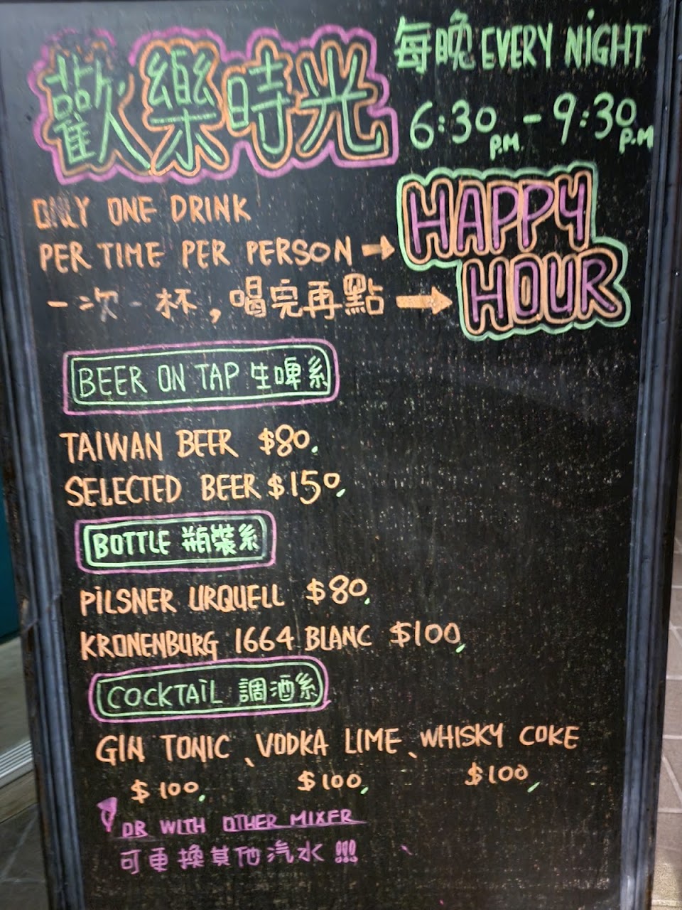 酒價格便宜,品質普通,Bartender很帥。氣氛很嗨,適合跑Bar時第一攤開聊,或最後一攤收尾~