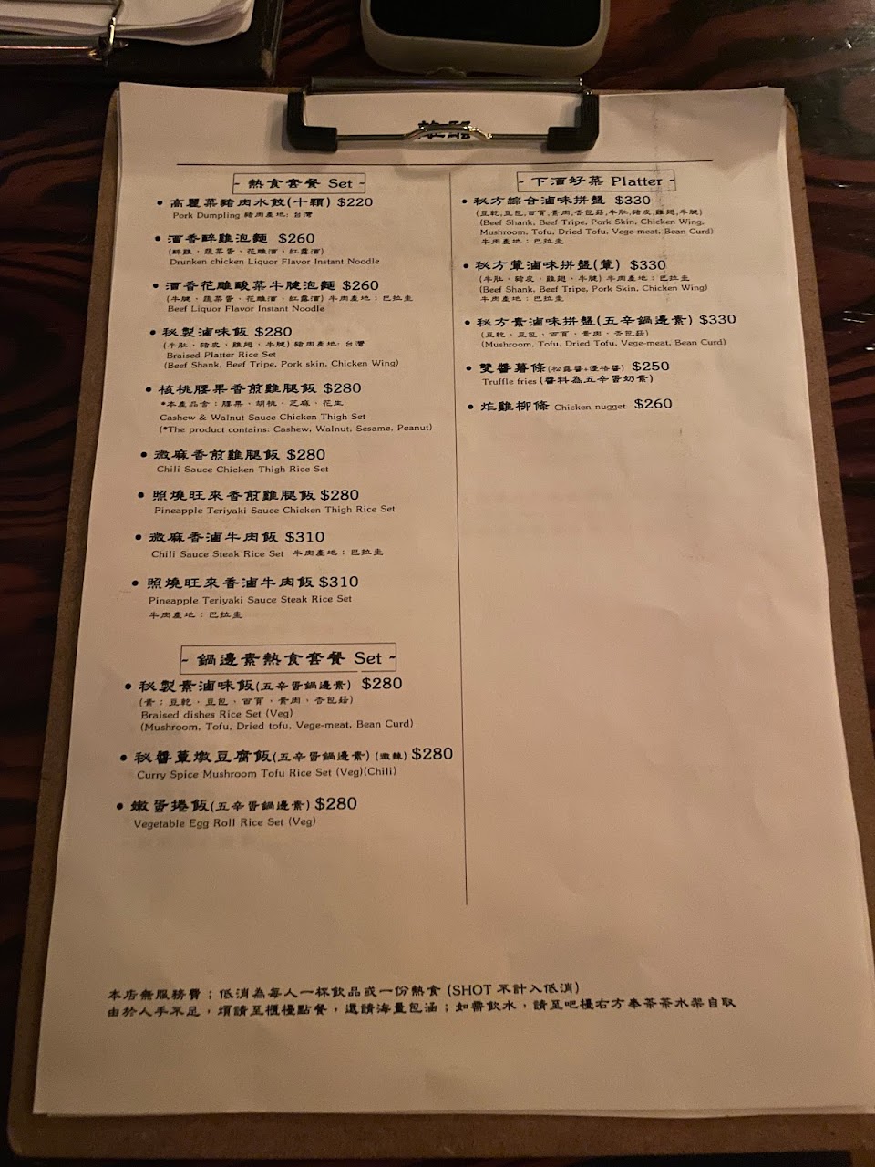 低消一杯飲料或一份餐點,不收服務費,收費很親民,環境比較年輕熱鬧,如果喜歡靜靜喝酒聊天的會比較不適合。滷味滷的很軟爛,調味微鹹,比較不是個人喜歡的口感與調味,薯條現炸,提供的雙醬蠻好吃的。收實體信用卡,電子支付只有街口。