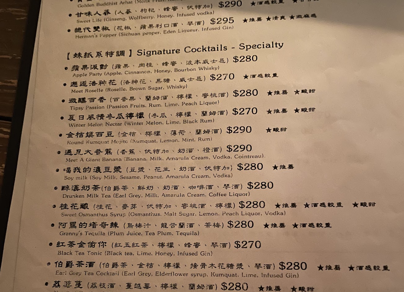 酒單貼心,有標示出酒感較重的品項。 特色中藥調酒嘗試感受是特別而新奇的,聚餐下眾人交互試喝,果茶感偏好荔莓蔓、桂花釀、金錢果實,清爽的紅茶金偷你,濃厚系喜歡大香蕉、濃豆漿,威士忌底的江湖玫瑰則馬上就讓人暈了~