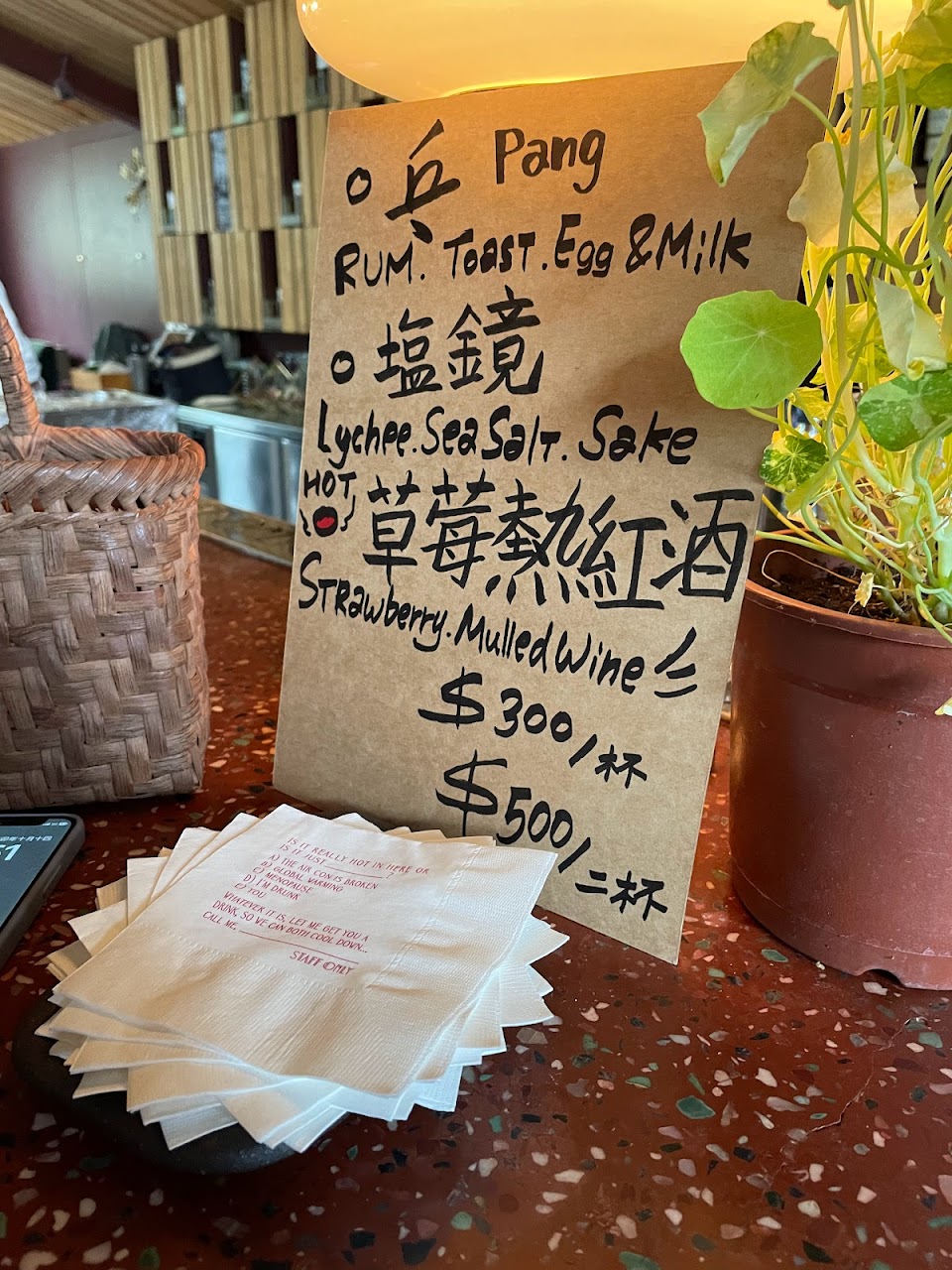 是發揮得最正常最好的一杯 整體酒感就像Negori帶有煙燻味道 酸梅湯的感覺 整體感覺苦香平衡 最配合此環境的一杯飲料