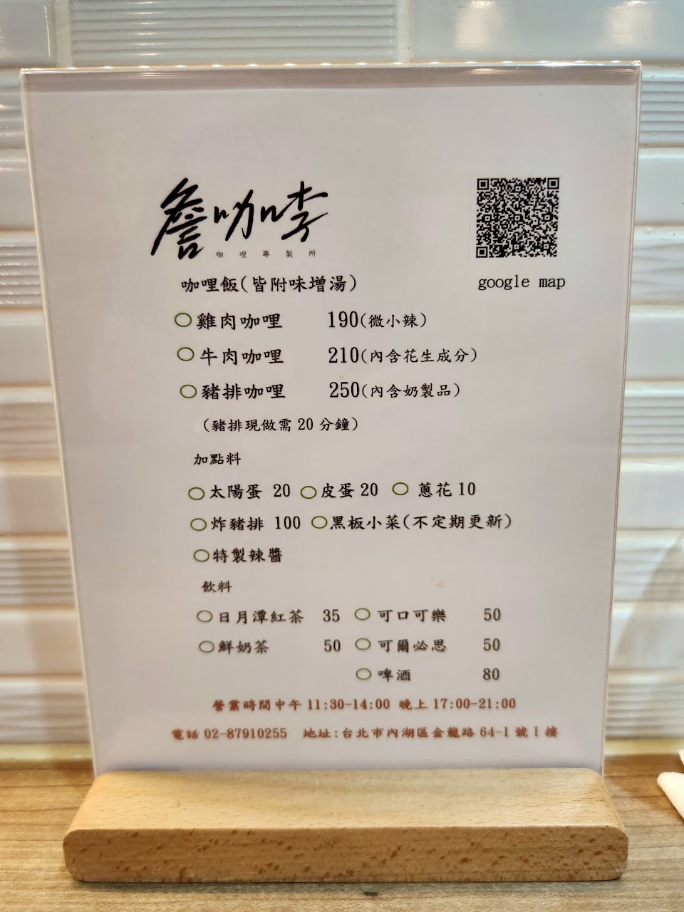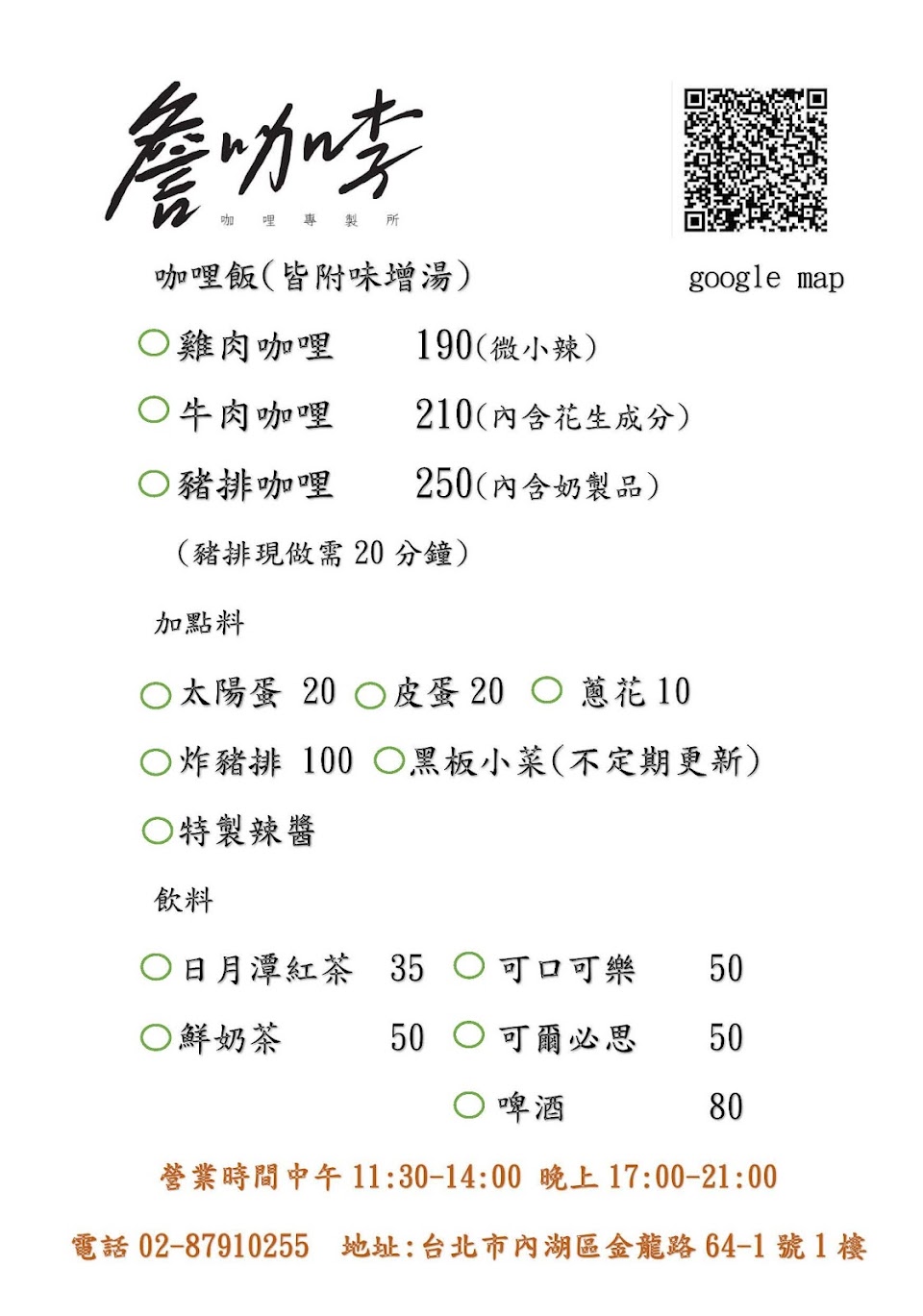 店家提供口味非常特別的日式咖哩餐點,每一種主食搭配的咖哩都不同,非常建議可以每一種咖哩都嘗試一下,豬排讓人相當驚艷,是必點的餐點。炸櫛瓜與烤蔬菜表現也都不錯。只是店家餐點現點現做,所以等餐時間可能會需要比較久,但美味是值得等待的。如果來到內湖捷運站附近,想吃吃咖哩飯那就一定要來這裡!