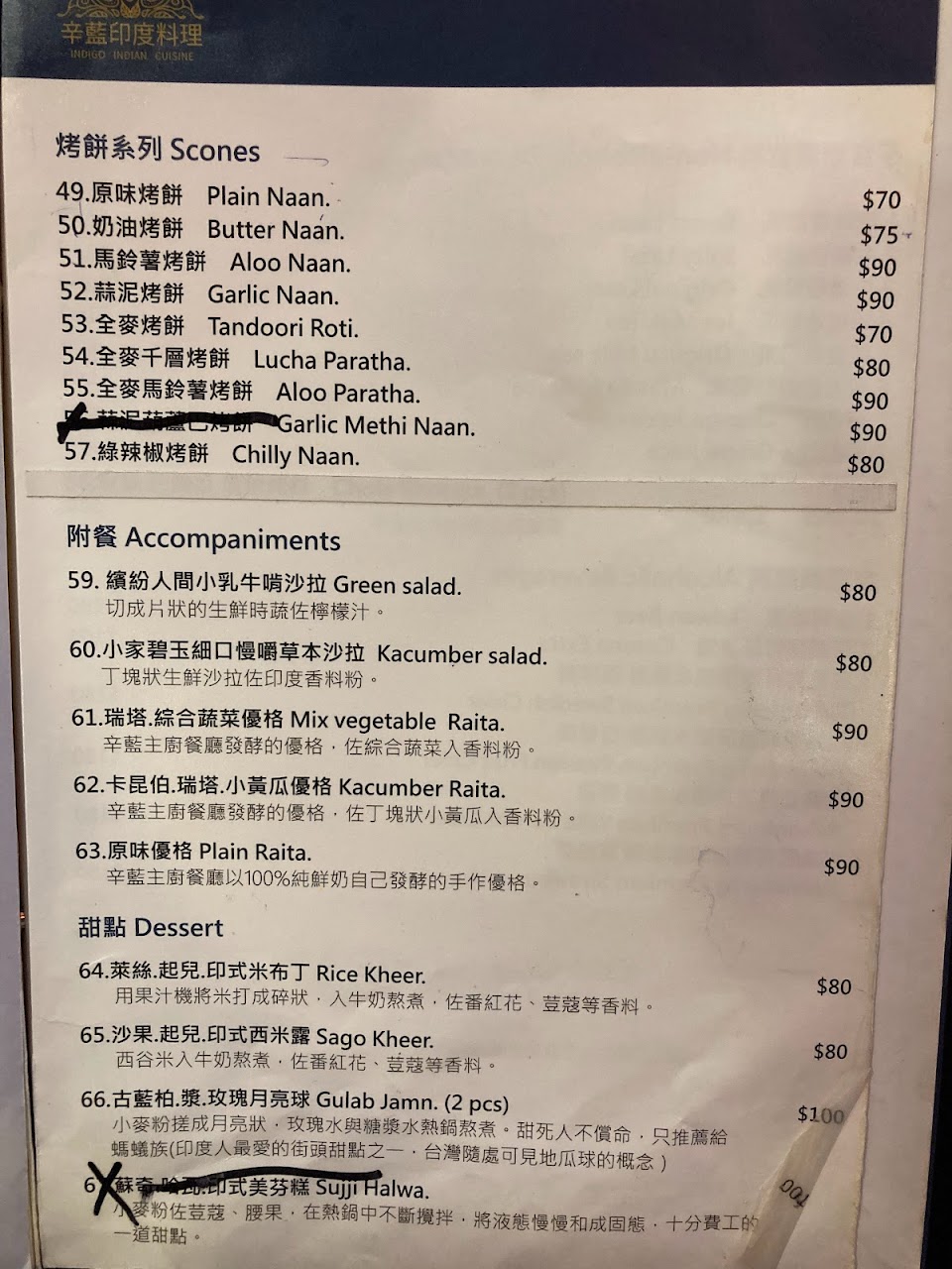 馬鈴薯烤餅90元:較少見,有點小油,但很香。配上咖哩很棒!中間、全麥烤餅70元:口味較清爽,樸實無華。都非常好吃