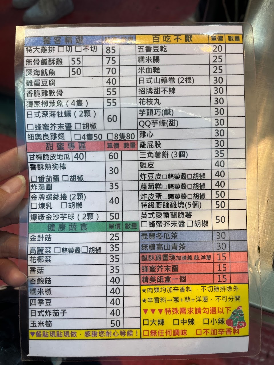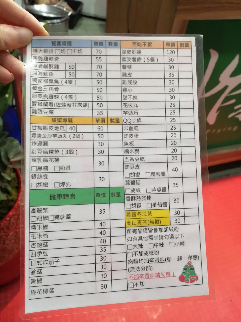 食物吃起來整體都還可以(重點在最後一句) 跟其他鹹酥雞店沒什麼不一樣 唯一讓我有疑問的是愛爾蘭瘋薯,一份$50 我問店員跟一般薯條有什麼不同,店員回答我比一般薯條更細一些。 我心裡OS是 這就是一般薯條呀,外面賣$30/$40 所以加了愛爾蘭瘋薯這個名字變成$50。我是不會再點薯條了。