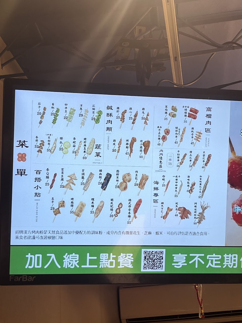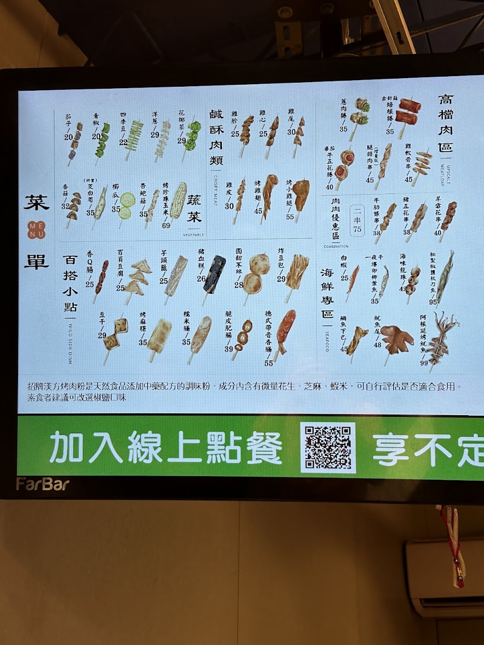 Cp 值很高烤串店,食材都很新鮮,蔬菜不會垂垂老老的,價格標示明顯,而且等餐時間不會很久!推推~