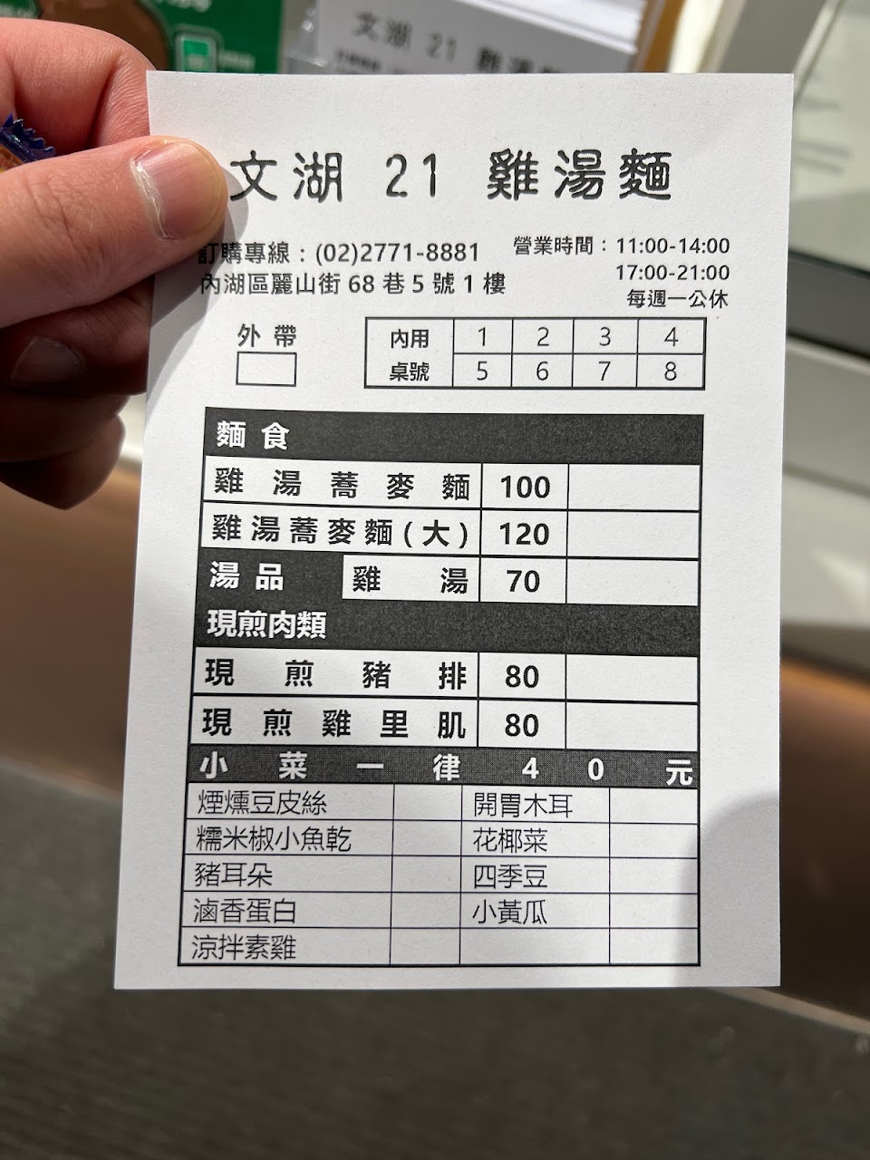 簡單的一款雞湯麵、自取小菜和現煎肉品,室內外的用餐環境都滿整潔舒適的
