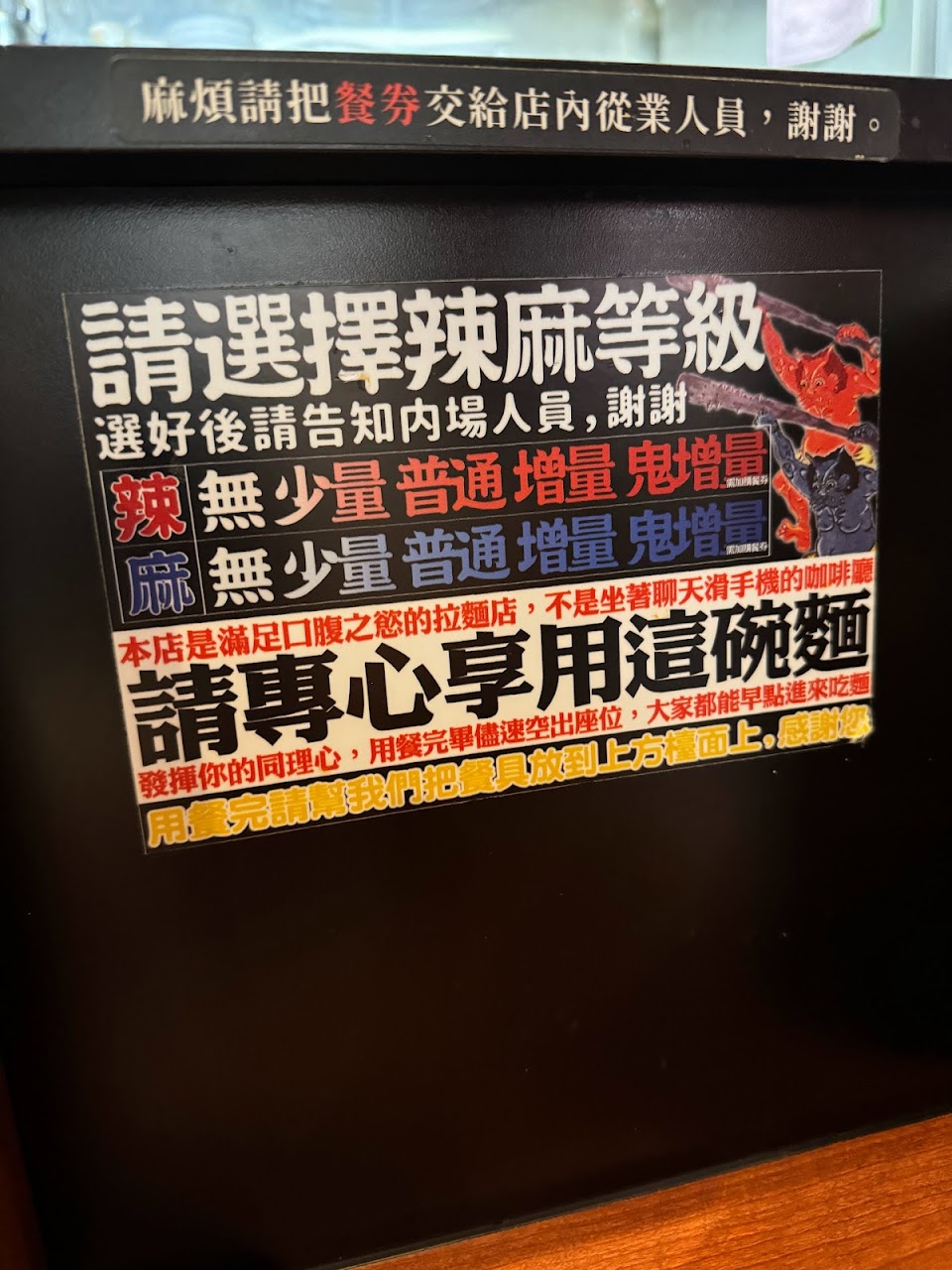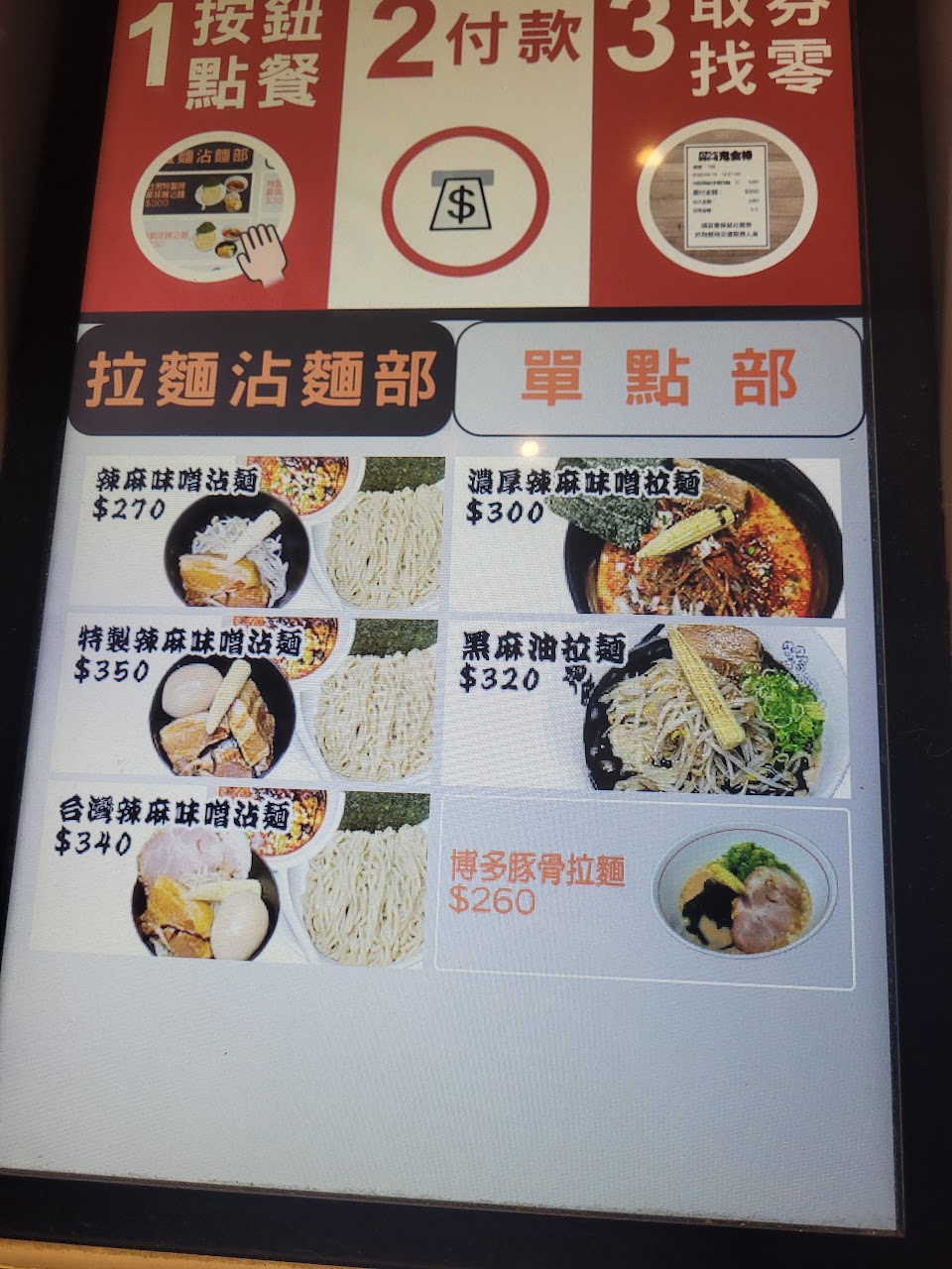 來到這裡用餐,第一件事除了確認有多少人候位,接著就是去店外的餐券機點餐,確認上面是否有自己想要的餐點,完成付款點餐後(僅收現金和街口支付)再加入排隊的行列。