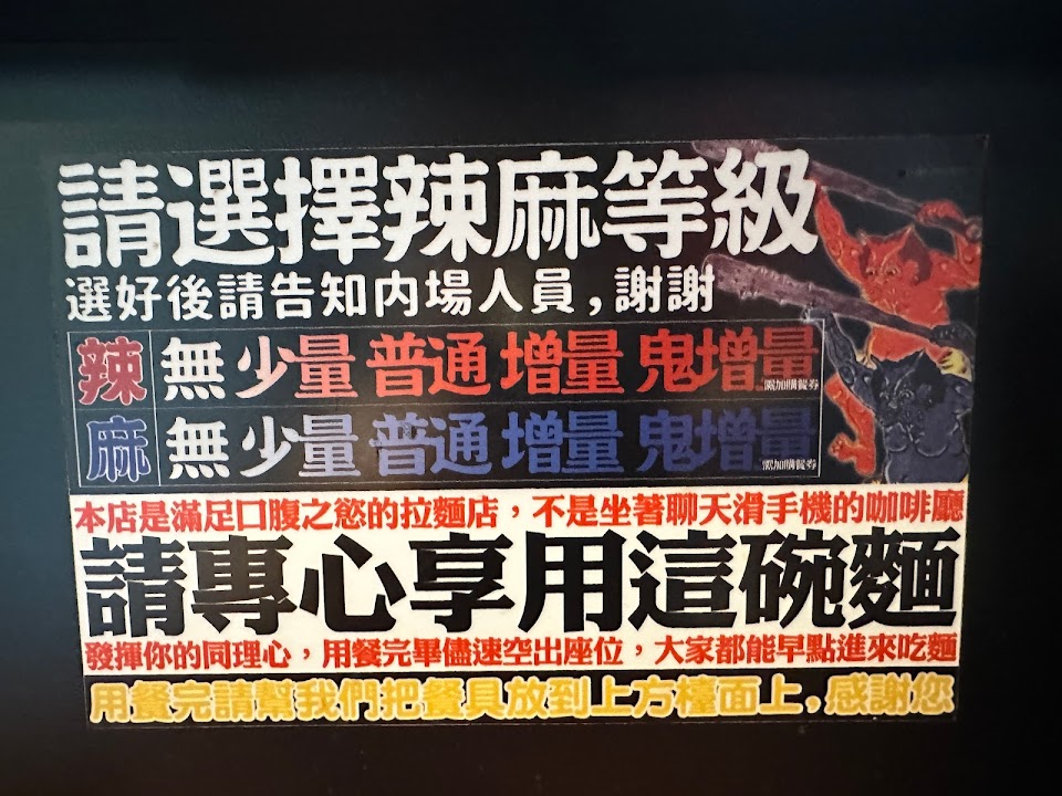 別館非尖峰時間幾乎不用排隊,沒有沾麵,店面非常狹窄,走進去的時候被販賣機卡到肚子好痛。辣麻拉麵湯頭香濃,玉米筍是冷的,豆芽菜份量似乎比以前少,麵中規中矩,主要是麻的部分非常香。