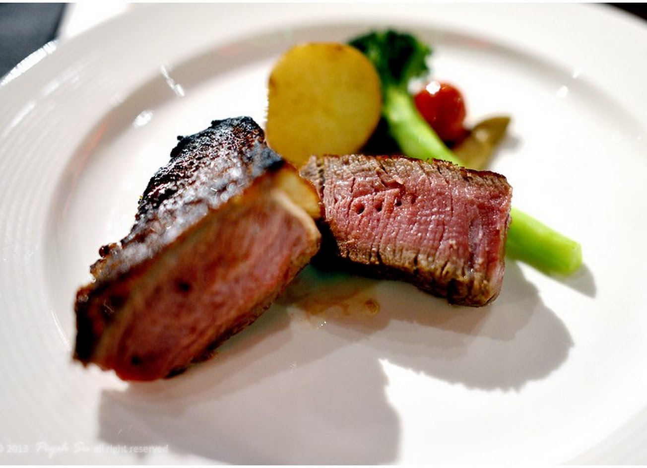 一直是口袋裡的名單,襯老婆大人生日的機會,決心在名單上劃上一筆,go! 餐廳裡的熟成牛有55天﹑75天﹑100天和128天之分,牛肉的熟成過程,水份會從牛肉內蒸發出來,這就讓牛肉味更濃,另外牛肉本身的酵素,會分解肌肉內的組織,令肉質變的更軟嫩,所以熟成天數愈多,所需要的技術掌握愈高,價格就自然愈貴。 第一次到訪,從55天開始品嚐,當天也是父親節優惠的日期內,好像是點28oz以上熟成牛,就送波士頓龍蝦一隻,雖然個人覺得不搭,但心裡還是覺得來得合時。 我們兩人是點帶骨肉眼28oz share,上桌時已經知道是吃不完了,真的不少的一塊;牛肉味濃,卻不是特濃,很有可能是吃之前的心裡作用影響,嚐完第一口之後,心想應該從75天開始才對,只是這時開始後悔晚了,何不從中找出優點? 帶骨肉眼最好吃的部份是頭跟尾,就是那切成三角型部份和帶骨的部份的肉,濃﹑嫩程度會讓你不自覺閉上眼的想把這感覺停留在口中久一點;吃到帶骨的部份時,其實已經很飽了,店員貼心的說幫我們請廚師去骨把肉切片,心中卻一直大喊著想打包外帶,幸好這部份好吃,在飽的狀態下也能吃完。總體說,牛肉的口感味道值得下次再來嚐嚐75天的。