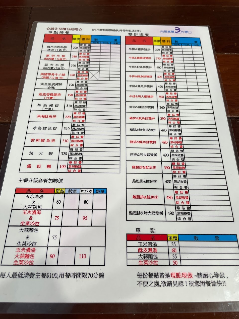 3.店內排餐無附濃湯及麵包,需額外加點。