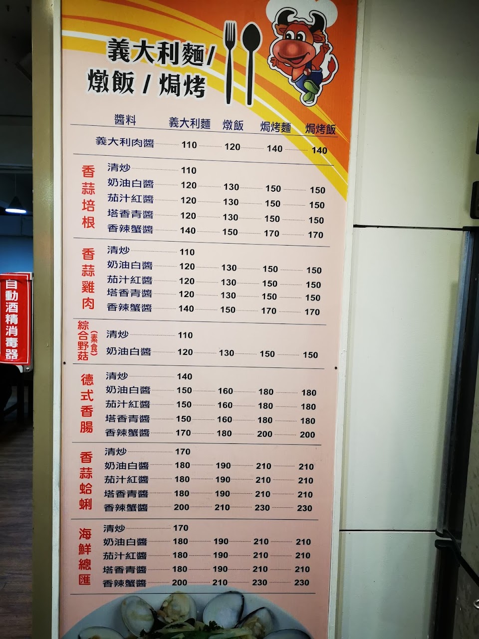 平價牛排,義大利餐飲店,隨餐附贈一杯紅茶,可加價選購沙拉,麵包,濃湯!是荷包不深的學生族最愛的好去處!餐點口味適中,常滿座,要有耐心等候!