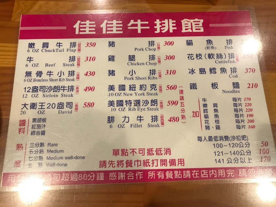 平價老店牛排館,料多實在。沙拉吧中有好吃的滷肉飯很特別。大直也有一家佳佳牛排,則是有鹹粥。價位約當名子一樣不知是否有關聯