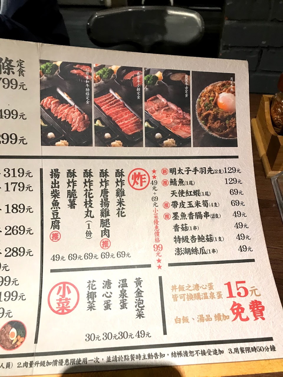 一直是內科下班的愛店,很推招牌牛排丼跟直燒雪花牛,加上(應該是)烤過的杏鮑菇或者玉米筍配菜總是很有味道,最加分的是無限喝的湯品,可能有兩三種,味噌湯、牛蒡蘿蔔湯都可以喝到飽,不是那種隨便附贈的湯等級,是很多料跟味道的湯,所以一直沒機會點到小菜。整體還是五顆星。但是還是要抱怨一下,總是八點才能趕過去吃,有一次就被店員說打烊了不接客,一直以來都是八點出頭去,結果第一次被擋住互相尷尬了一下還是被放進去吃了,如果真的要改營業時間或者最後點餐時間希望可以寫在網路備註,我也不想當奧客。