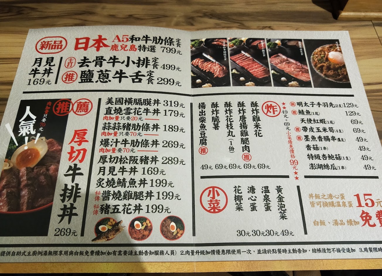 吃過三次 喜歡他們的月見牛丼 溫泉蛋黃搓破跟飯攪拌一起搭配烤肉汁 很美味 內有湯品無限 多數是味噌湯 有時候是牛蒡湯 很好喝 不是湊合隨便煮煮那種 唯一美中不足是飯粒的控管 三次吃的口感都不一樣 這次的最乾 有點硬 豬肉系列不推 口感都有點乾柴