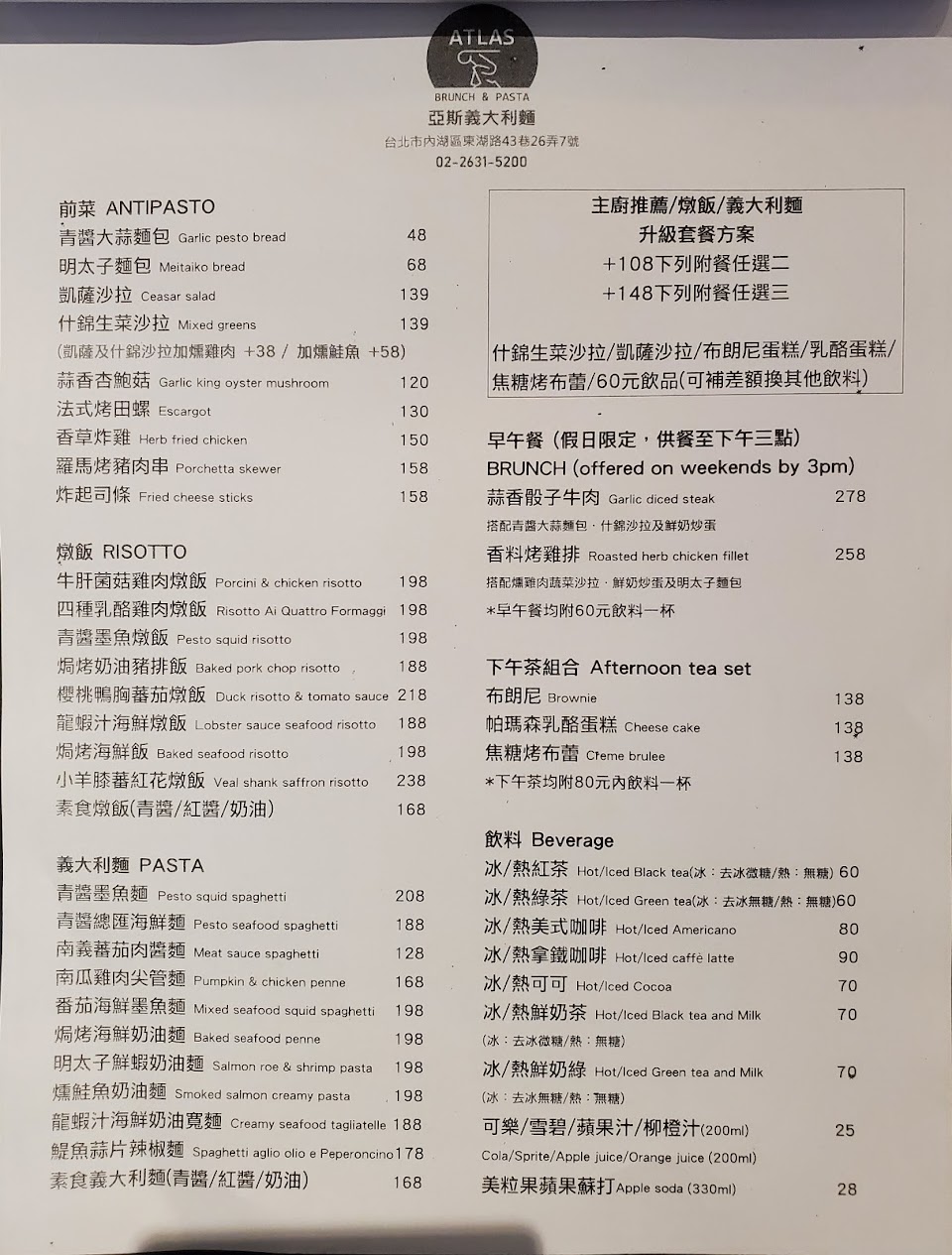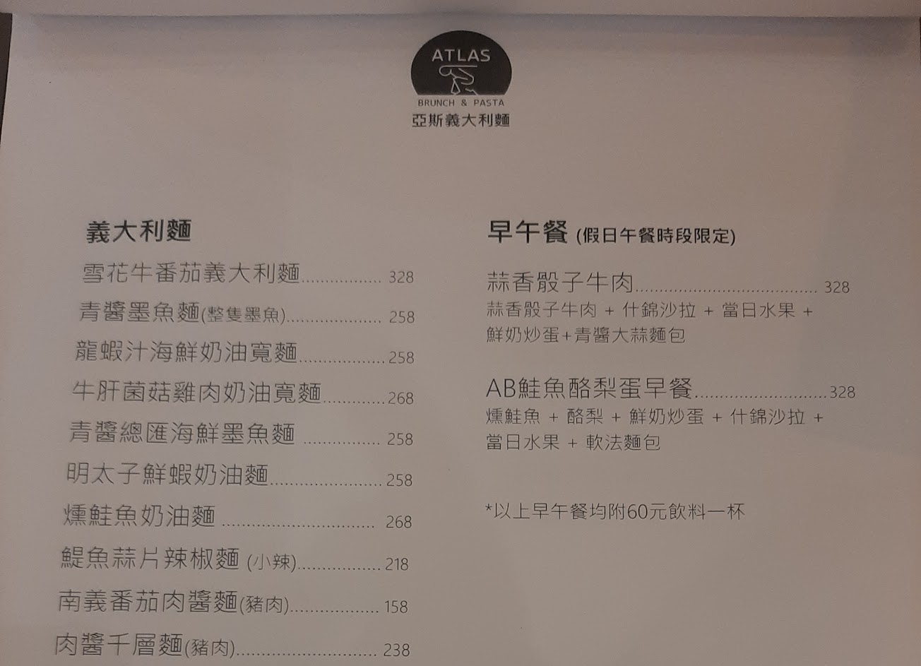 2024最新在地推薦餐廳的菜單_Atlas Brunch & Pasta 亞斯義大利麵的菜單、圖片