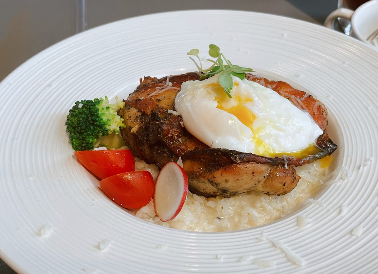 溏心蛋骰子牛白醬燉飯 法式乳酪布丁 什錦沙拉
