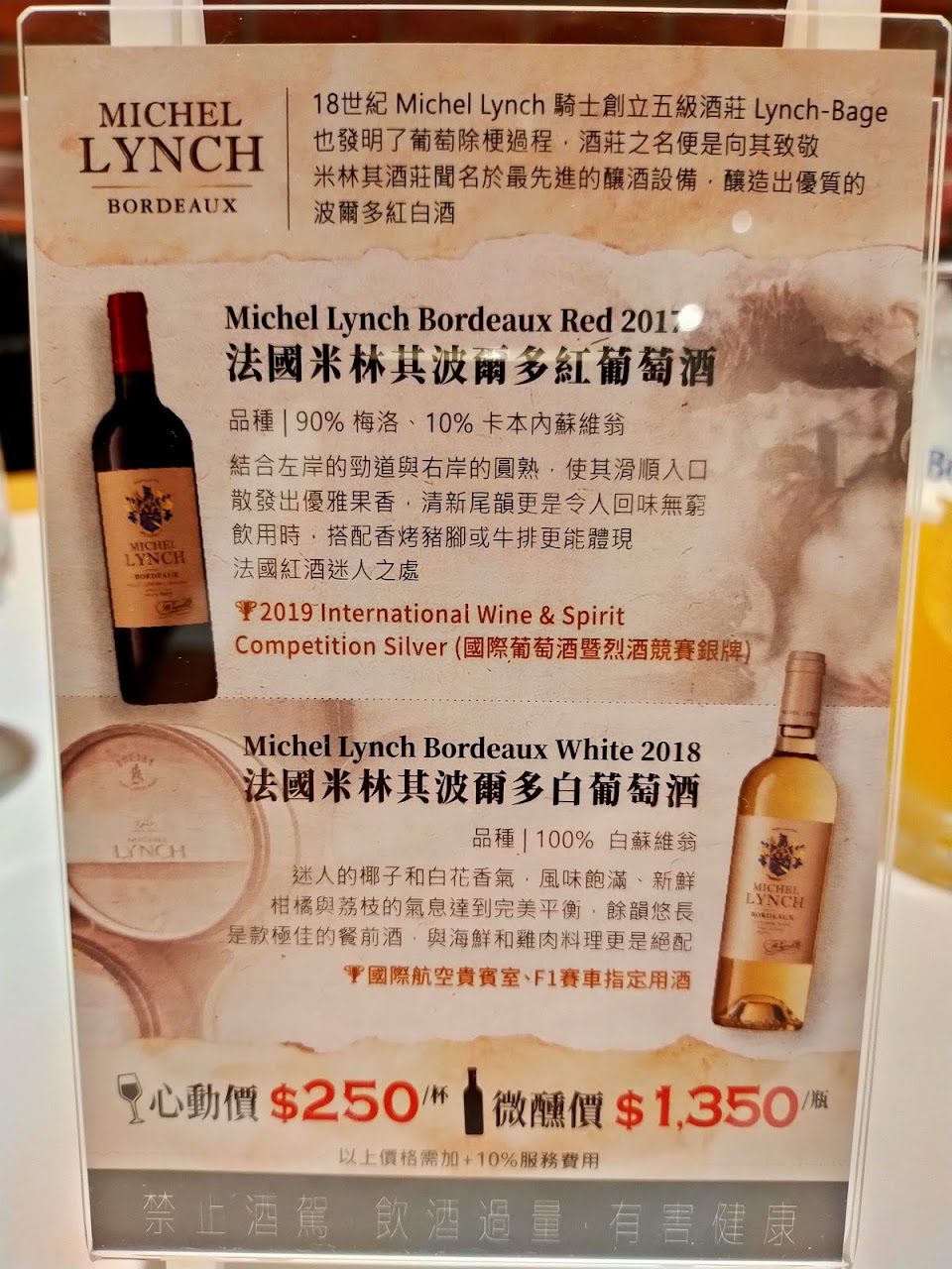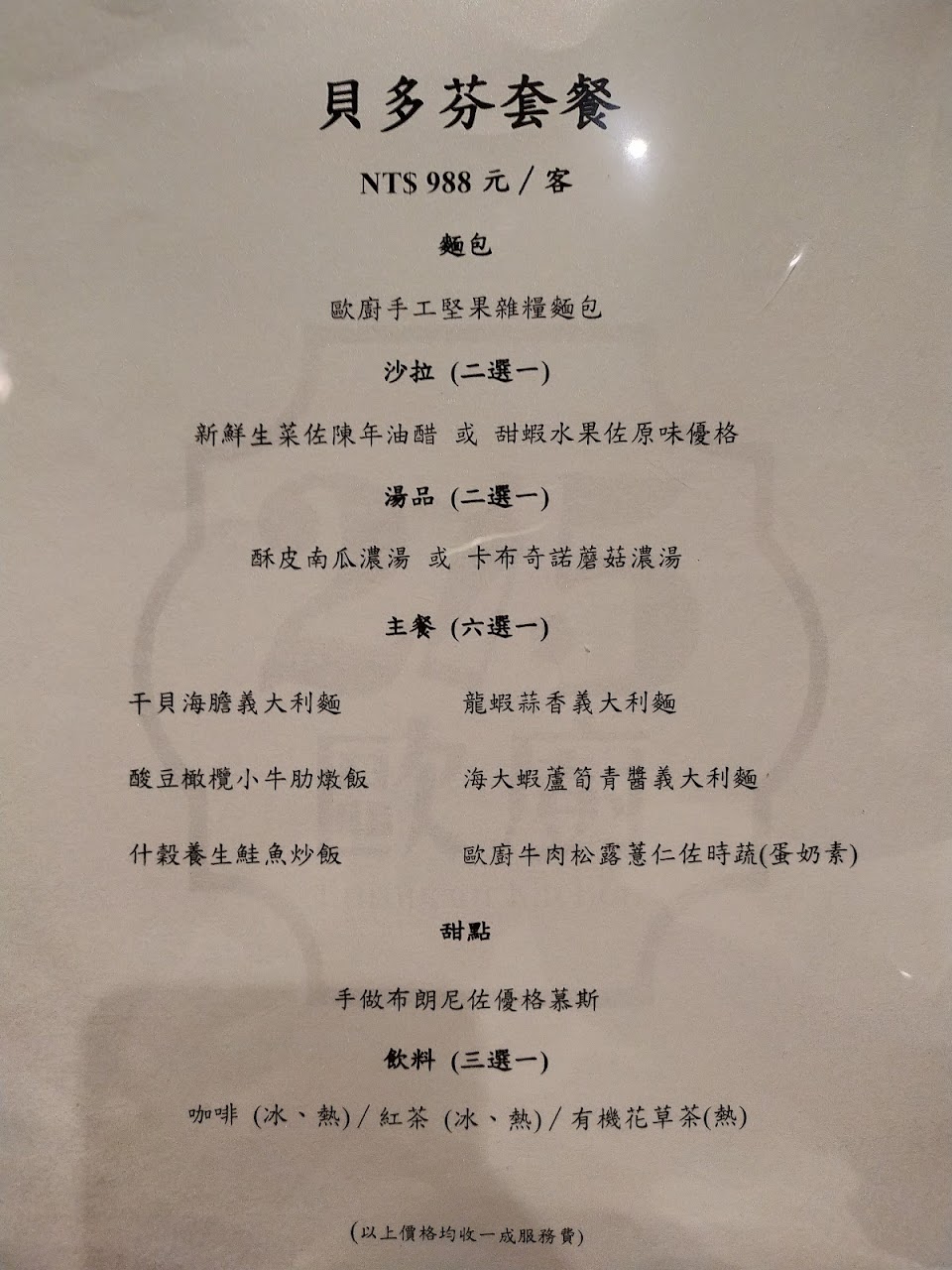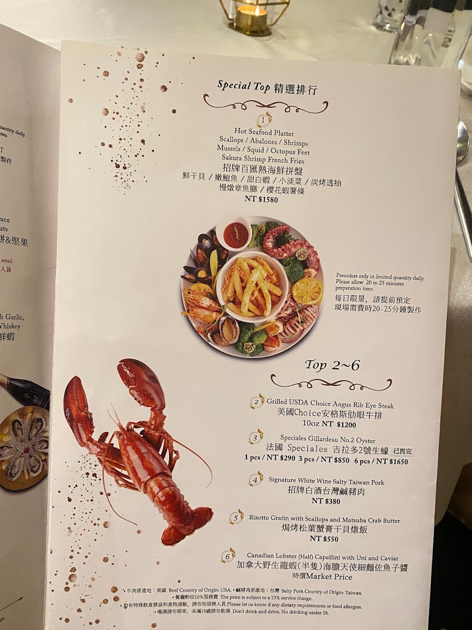 感覺應該是以排餐龍蝦等等為主 (牛排羊排簡單明瞭不用解釋). 菜單的寫法編排方式很“台”(海鮮義大利麵,雞肉義大利麵??), 酒單上的酒對一個西餐廳來說太少. 沒有英文菜單. 跟朋友走進又走出,不想吃排餐,義大利麵從菜單敘述又覺得應該不會太道地..仔細看了官網才來的,結果…. 良心建議,如果要讓樂團學習西式文化應對,還是要整套學習!!