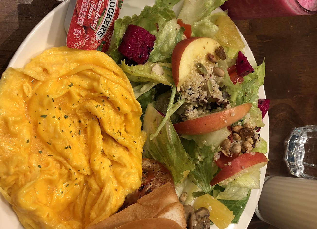 餐點份量大、一上桌就氣勢磅礴。沙拉值得鼓勵,即使只算side dish但內容豐富不馬虎(杏仁片、蔓越莓乾、番茄丁等)。太陽蛋煎的很美,蘑菇跟豆子調味都很棒。附上兩杯飲料,服務雖然少一點但不至於無理或冷漠,是吃完不會遺憾的店。