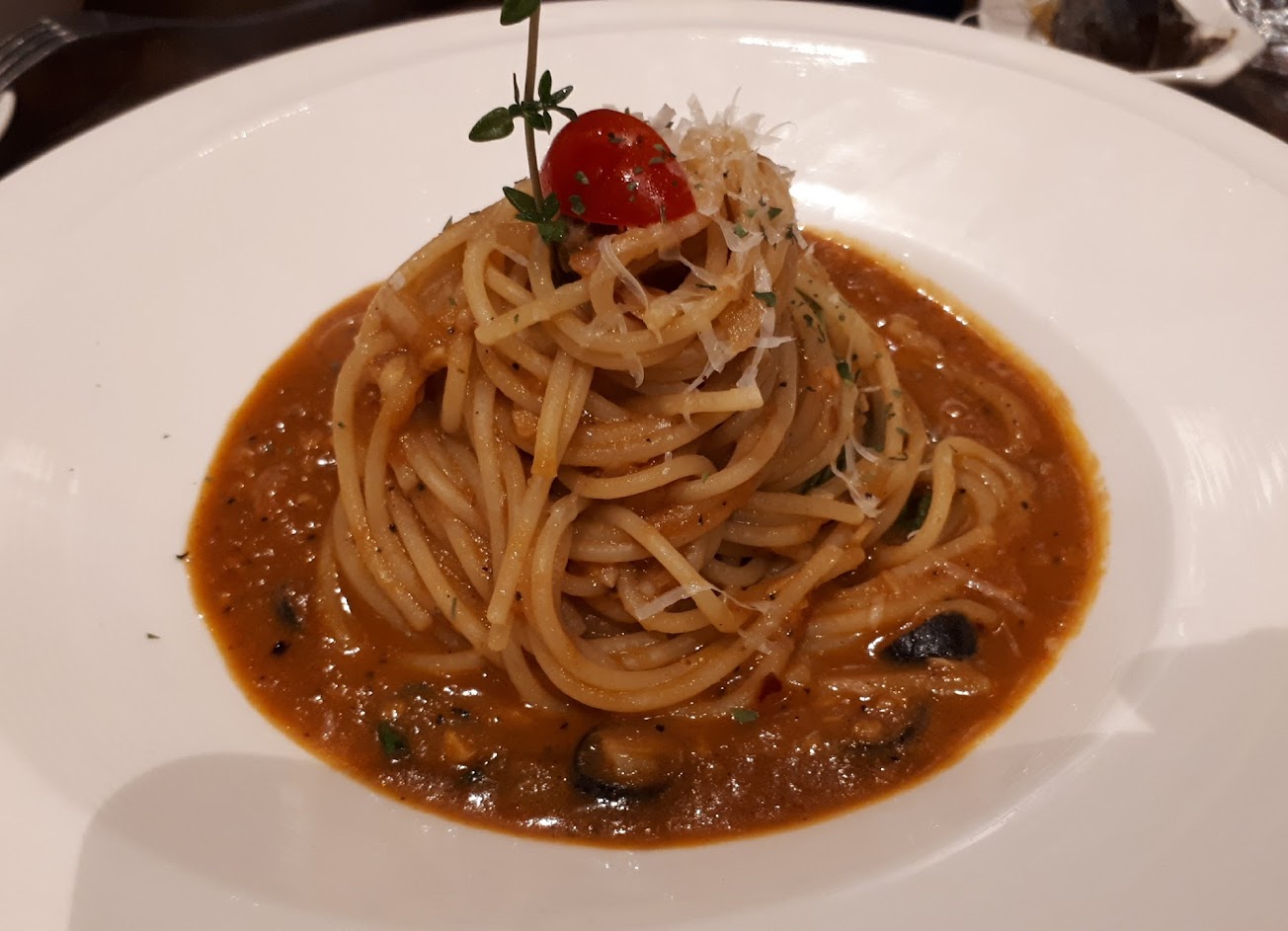 煙花女義大利麵,吃起來有點像是辣紅醬義大利麵,但它多了黑橄欖讓口感有不同的層次。
