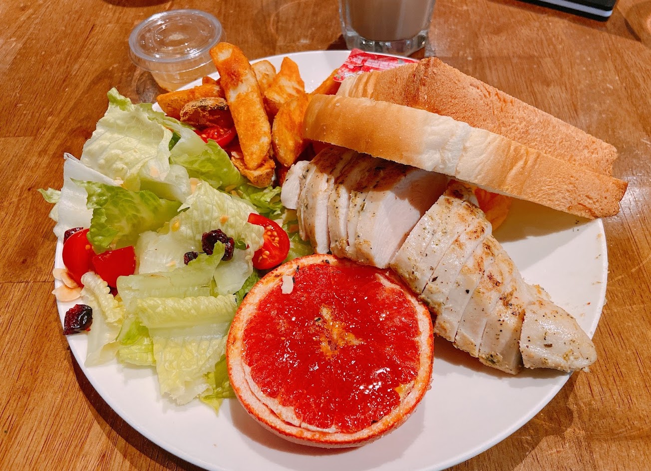 份量很足,超飽的 有附葡萄柚很特別,感覺餐點都蠻用心 副餐的薯塊超好吃? 只有附的沙拉比較還好~ 喜歡挑高的環境跟看板的畫~ 整體還可以 想吃粗飽推薦? 不過要精緻就不建議了~