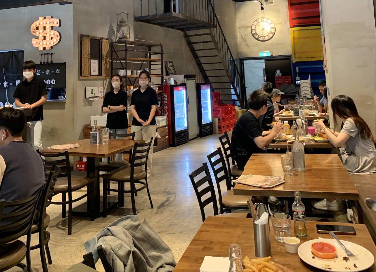 2.第一眼看到挑高的空間和大金剛壁畫,讓我想起小時候吃的“好萊塢星球餐廳(Planet Hollywood)”,但除了壁畫之外,餐桌椅倒真走倉庫風,木造、磚牆,位置也還算寬敞。環境6分(6/10)。