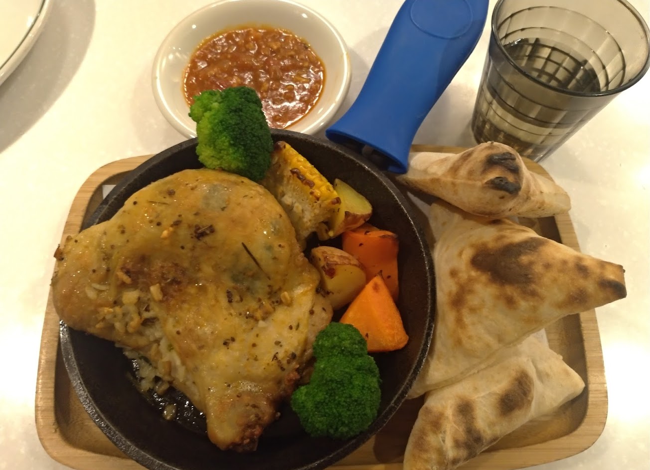 1/4烤雞+烤餅,是雞腿肉,軟嫩多汁,且食物真的是熱的(不是假鐵盤)