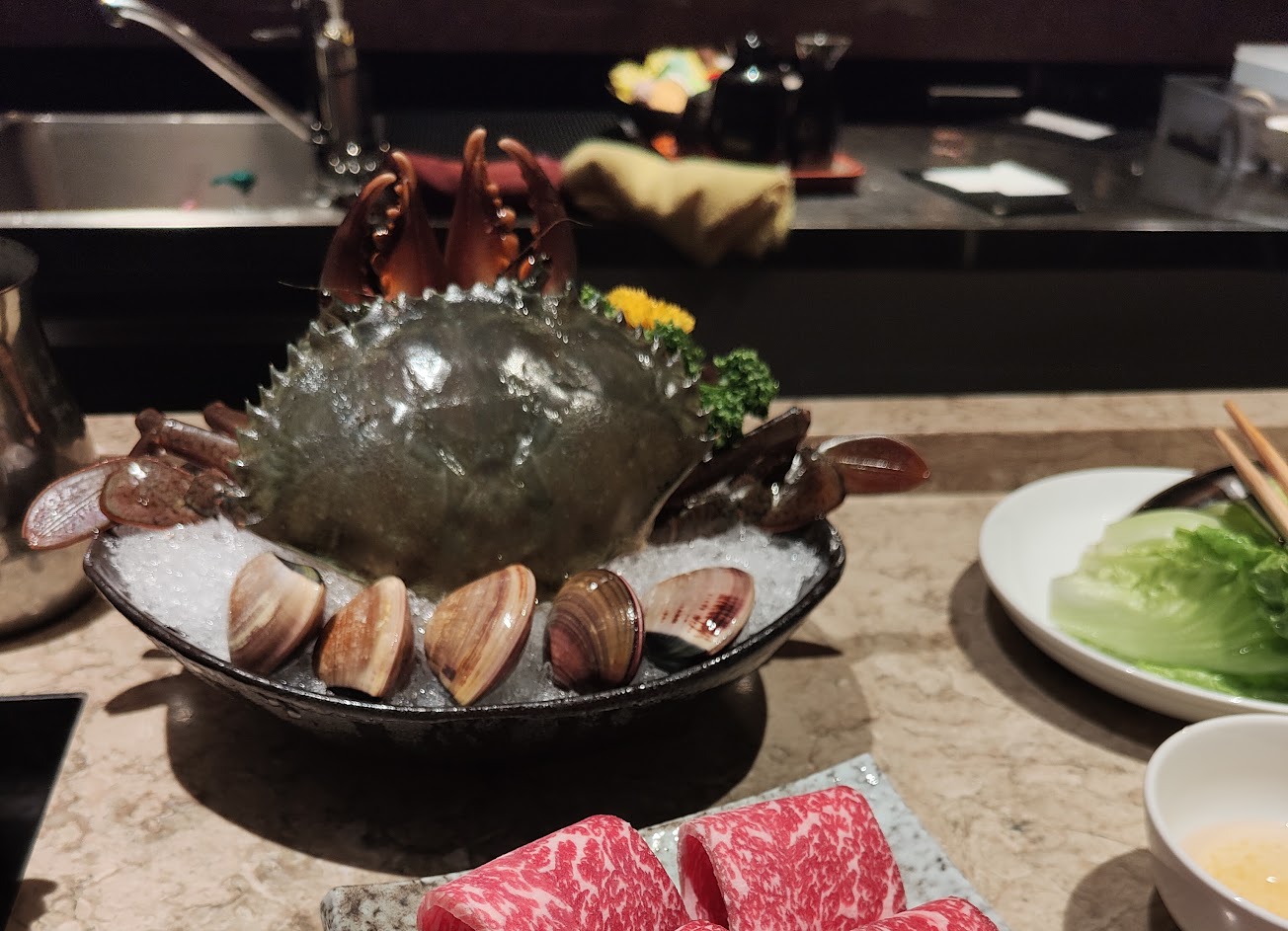 海鮮新鮮,蝦子跟玉米專人服務撥好,和牛肉質也不錯!甜點的杏仁豆腐跟焦糖布丁都好吃!