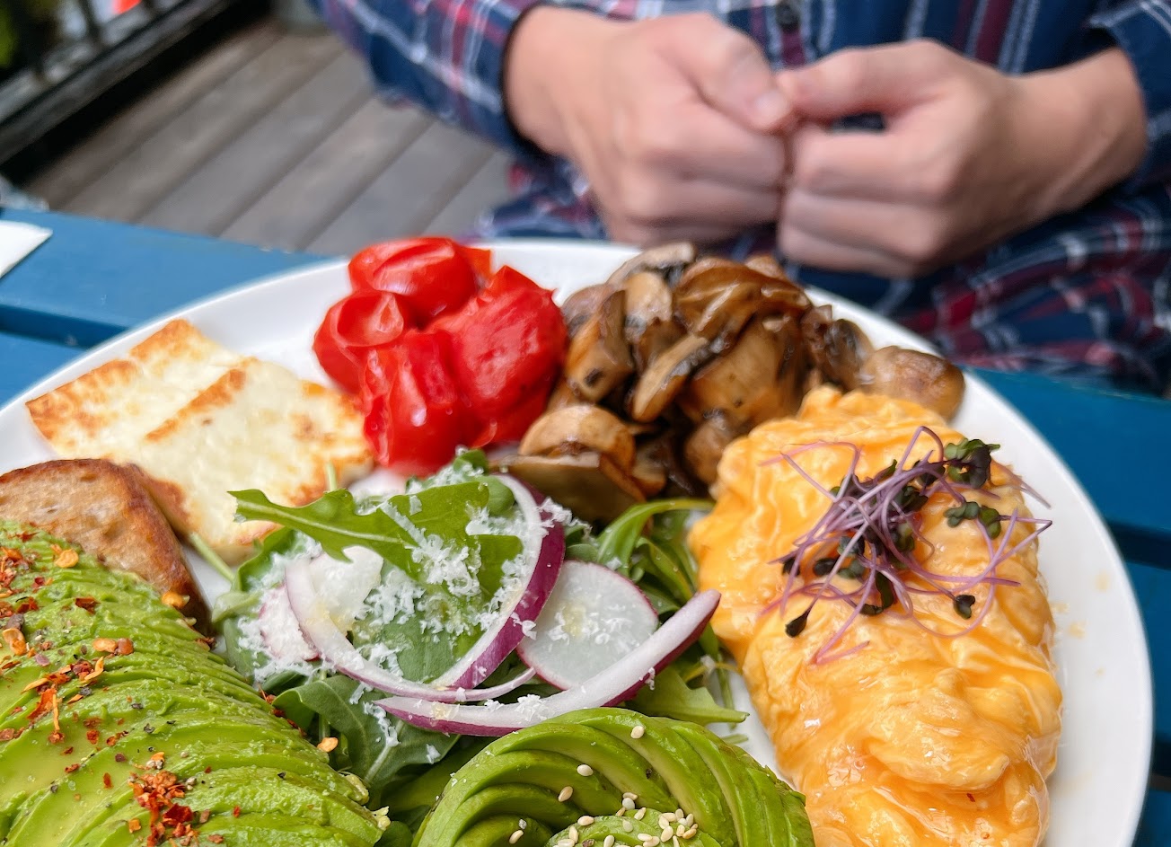 酪梨花、挪威煙燻鮭魚、香煎哈魯米起司、香料烤蕃茄、太陽蛋、香料草菇、香煎培根、香煎酸種麵包、芝麻葉沙拉、茄汁烘豆、木斯里果麥、季節水果優格