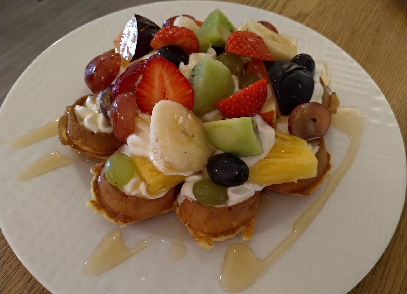 鬆餅天然無過度添加,上面的鮮奶油很讚,還有滿滿的新鮮水果。最重要的是有可愛的店狗