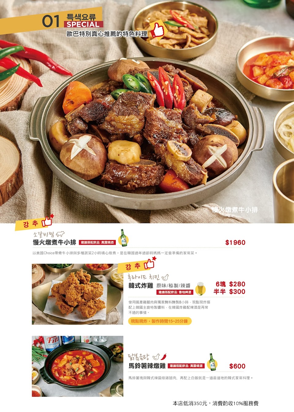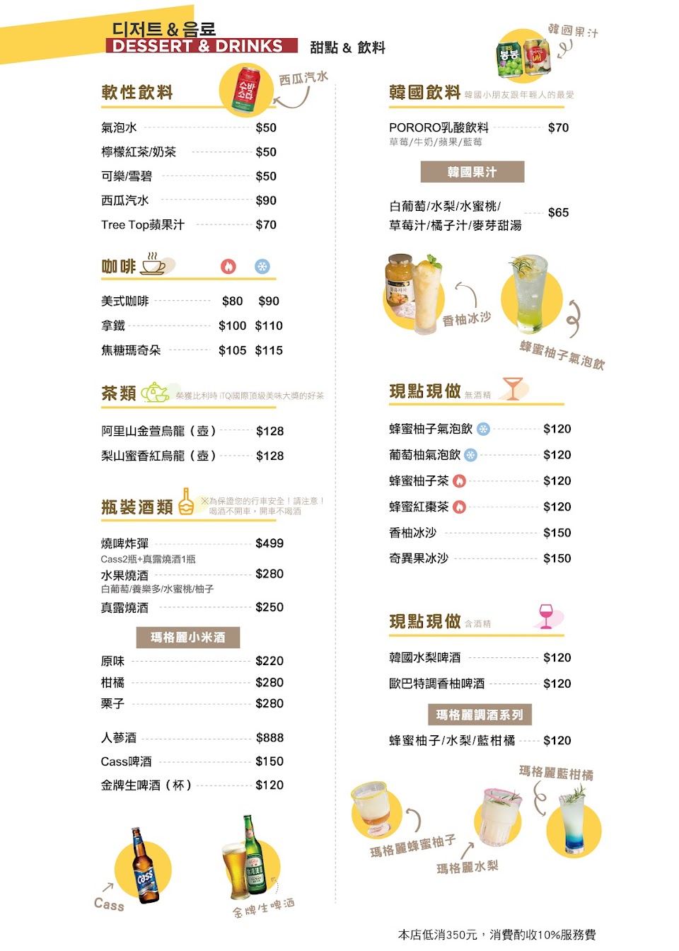 每人有底消$350,小菜可以免費續,口感偏甜味道一般般,韓式拌飯也普普通通,飯太軟且有點油,韓式炸雞搭配秘製特醬,炸雞外酥肉質啾喜,醬的表現遜色一點並沒有為炸雞加分.飲料的部分是瓶裝喔!