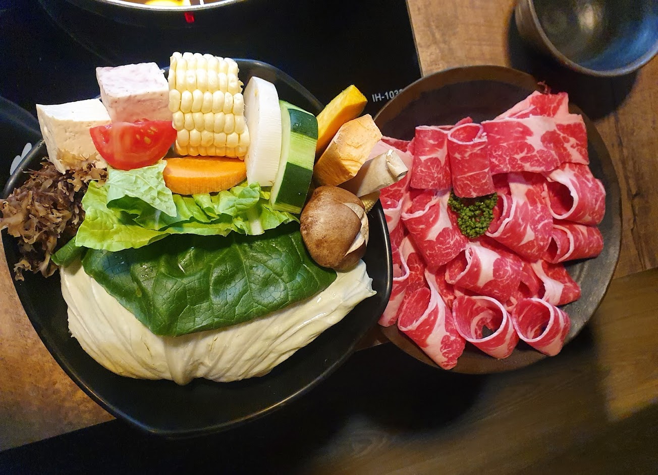 料整體來說肉質感很好,雪花牛有嫩有大片、松阪豬夠厚夠彈,鮮蝦蛤蜊更是能新鮮的活跳跳入口,青菜盤夠多喜歡吃菜也能續菜相當讚。