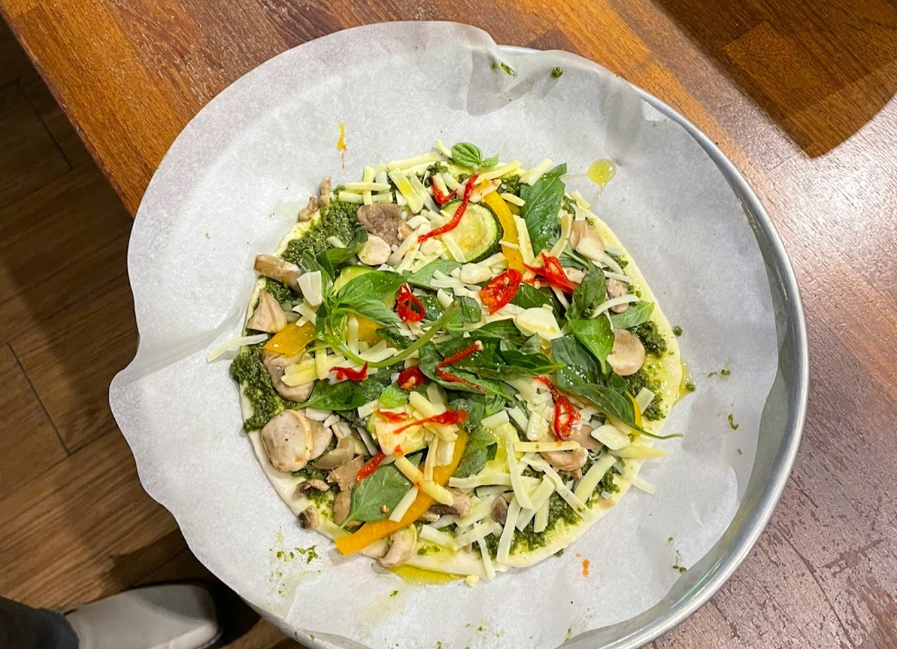 可以自己做披薩蠻有趣的 但是披薩加價買的雞肉好柴 因為是自助取餐和收桌 環境不是很整潔 很多桌子都還有食物殘渣 工作人員也沒整理