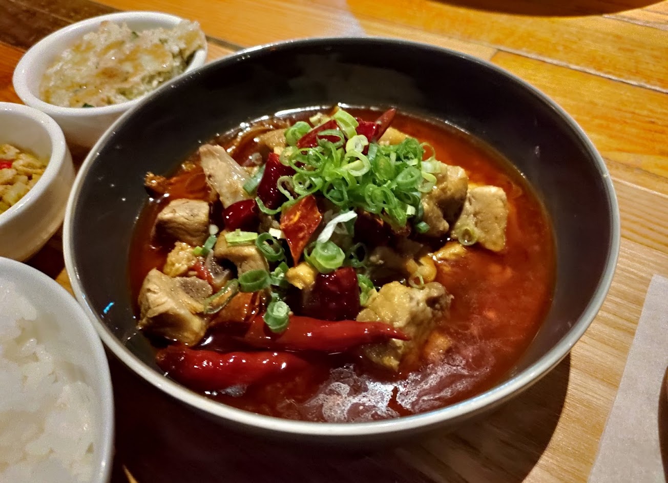 我們品嚐了中式套餐,一道主菜搭配白飯(無限供應)+熱湯+3道小菜(小菜可以續一次)。 ?蔥爆牛肉: 牛肉嫩、青蔥量多,兩者都炒得入味。 ?麻香燉腩排: 辣度溫和,適合大眾口味,醬汁非常適合拌飯。有點可惜香氣鹹度沒有完全進到肉裡。